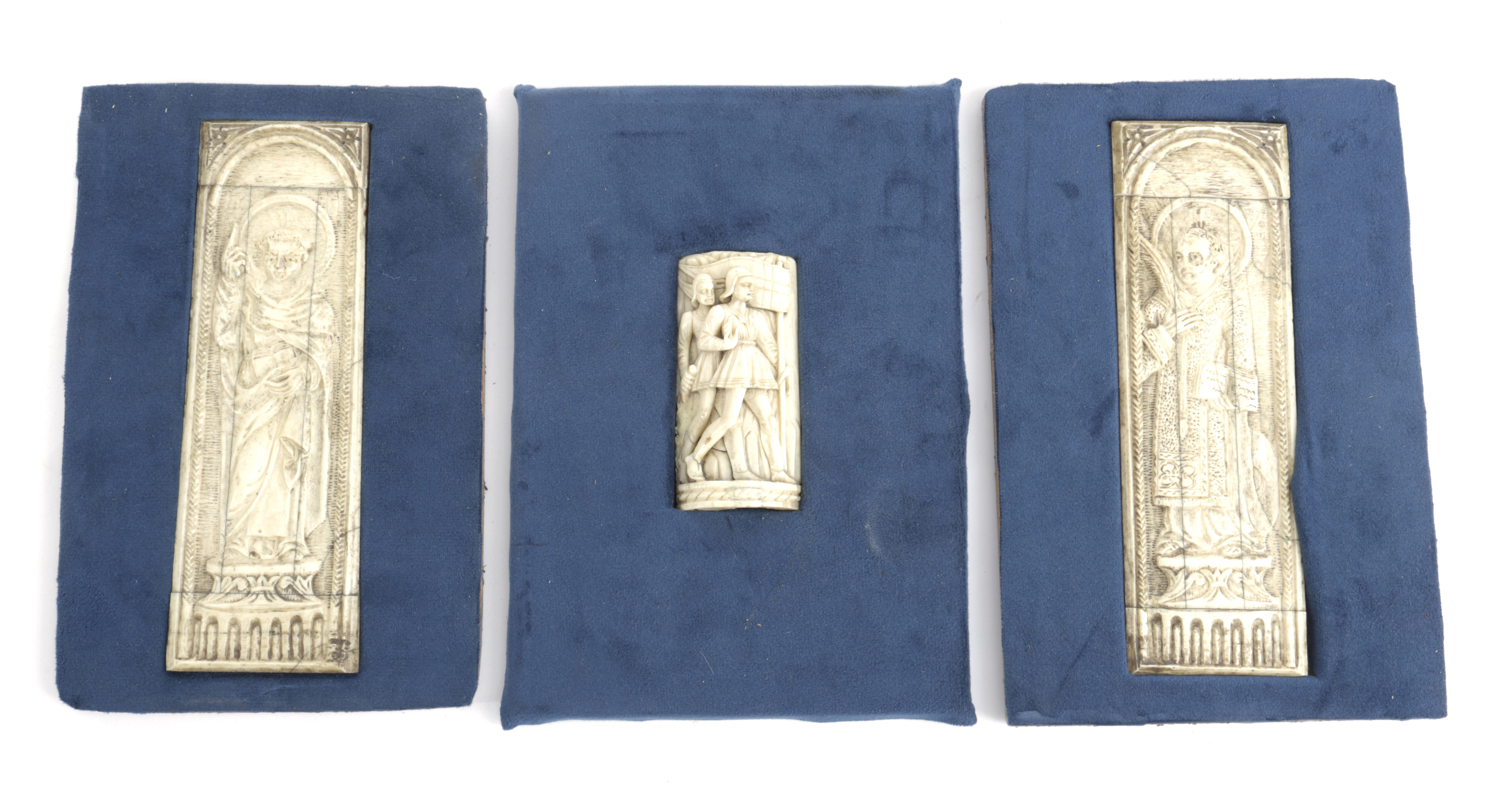 each standing under a round arch and on a low foliate pedestal, together with another bone panel of a similar period, French or Italian, carved with two soldiers, one carrying a banner, the other a sword (3)