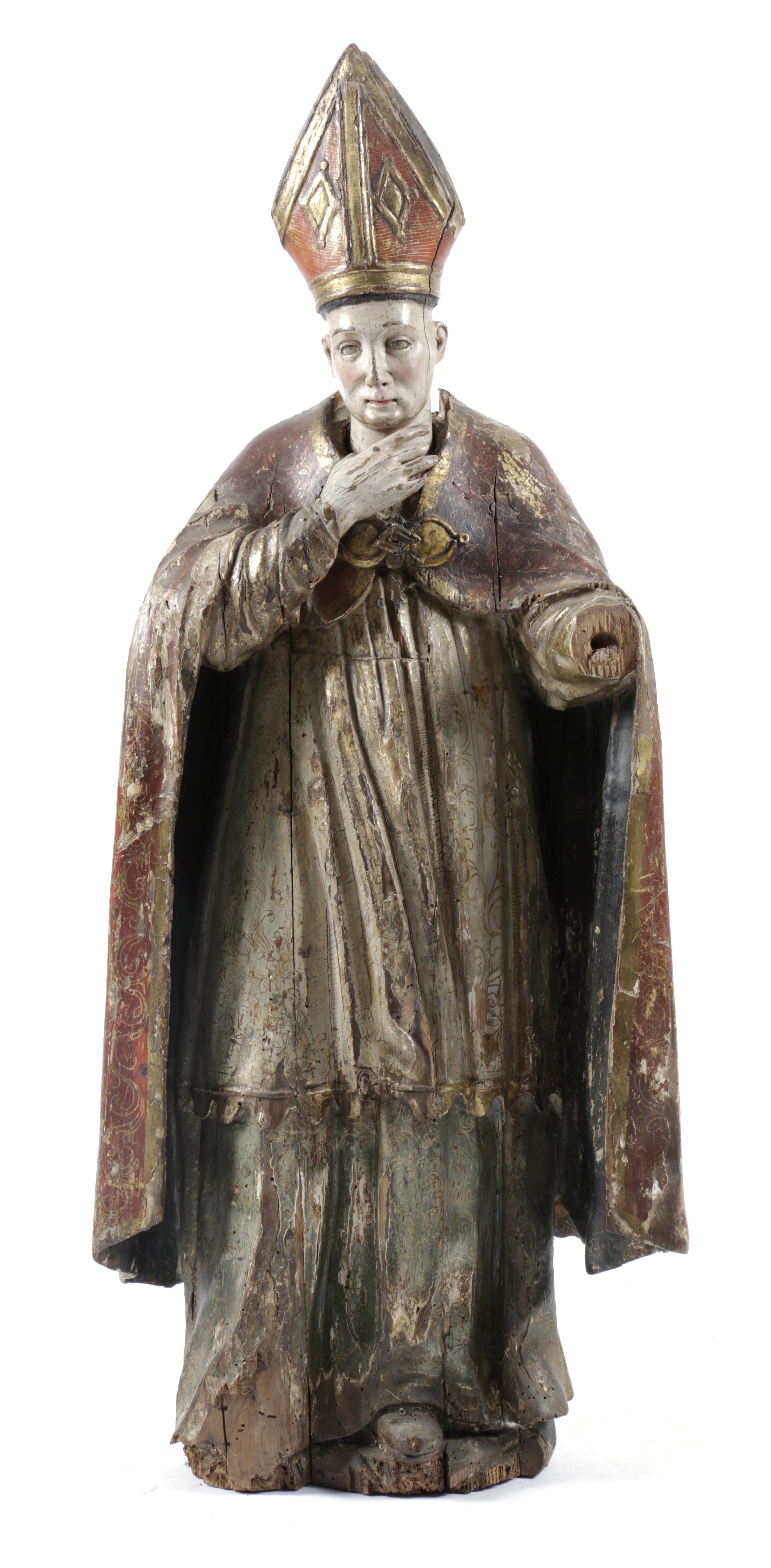 A SPANISH CARVED AND POLYCHROME GILTWOOD FIGURE OF A BISHOP
