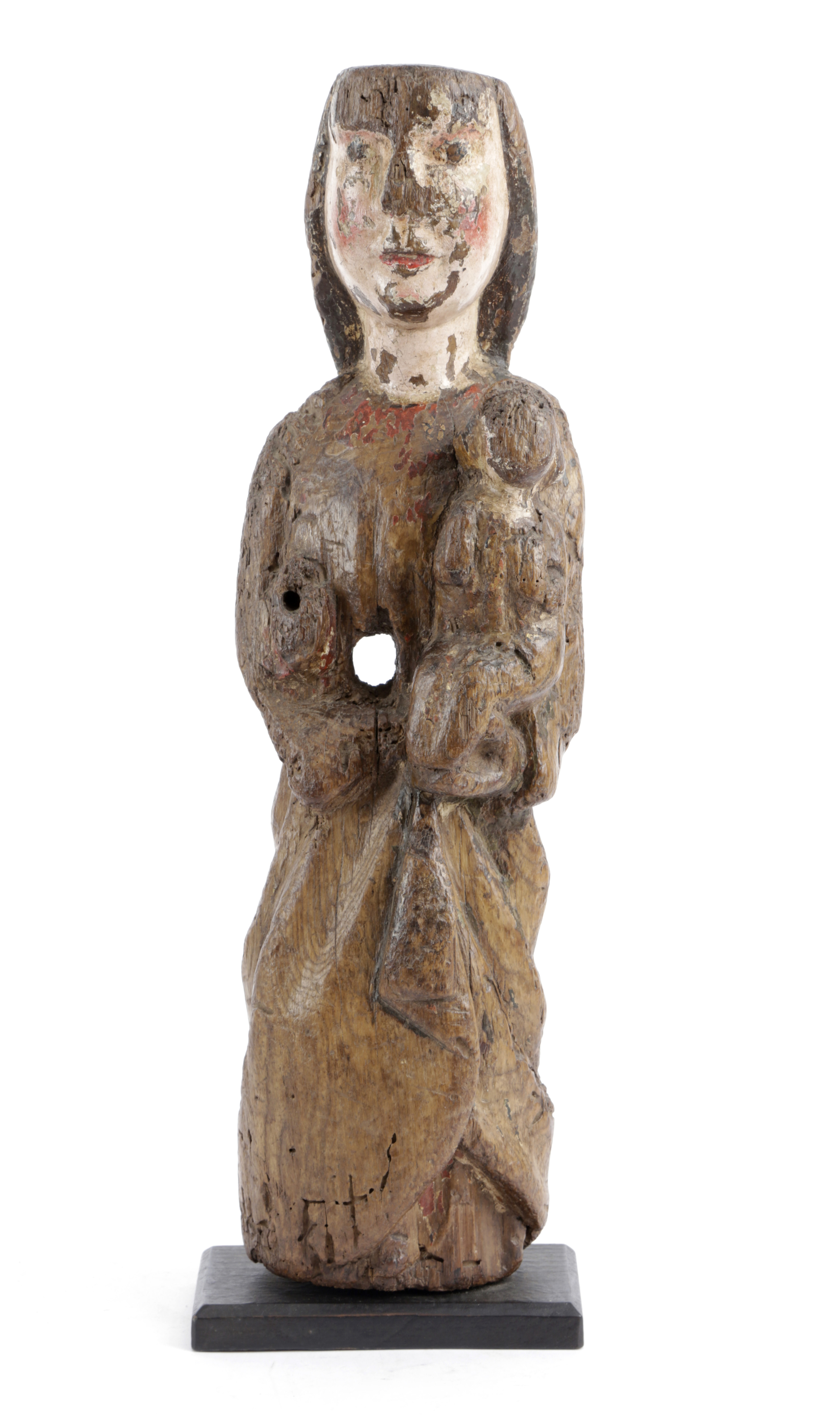 the serene Madonna, wearing a simple draped gown, holds the Christ child to her waist, with extensive original paint, particularly to the face and shoulders of the Madonna