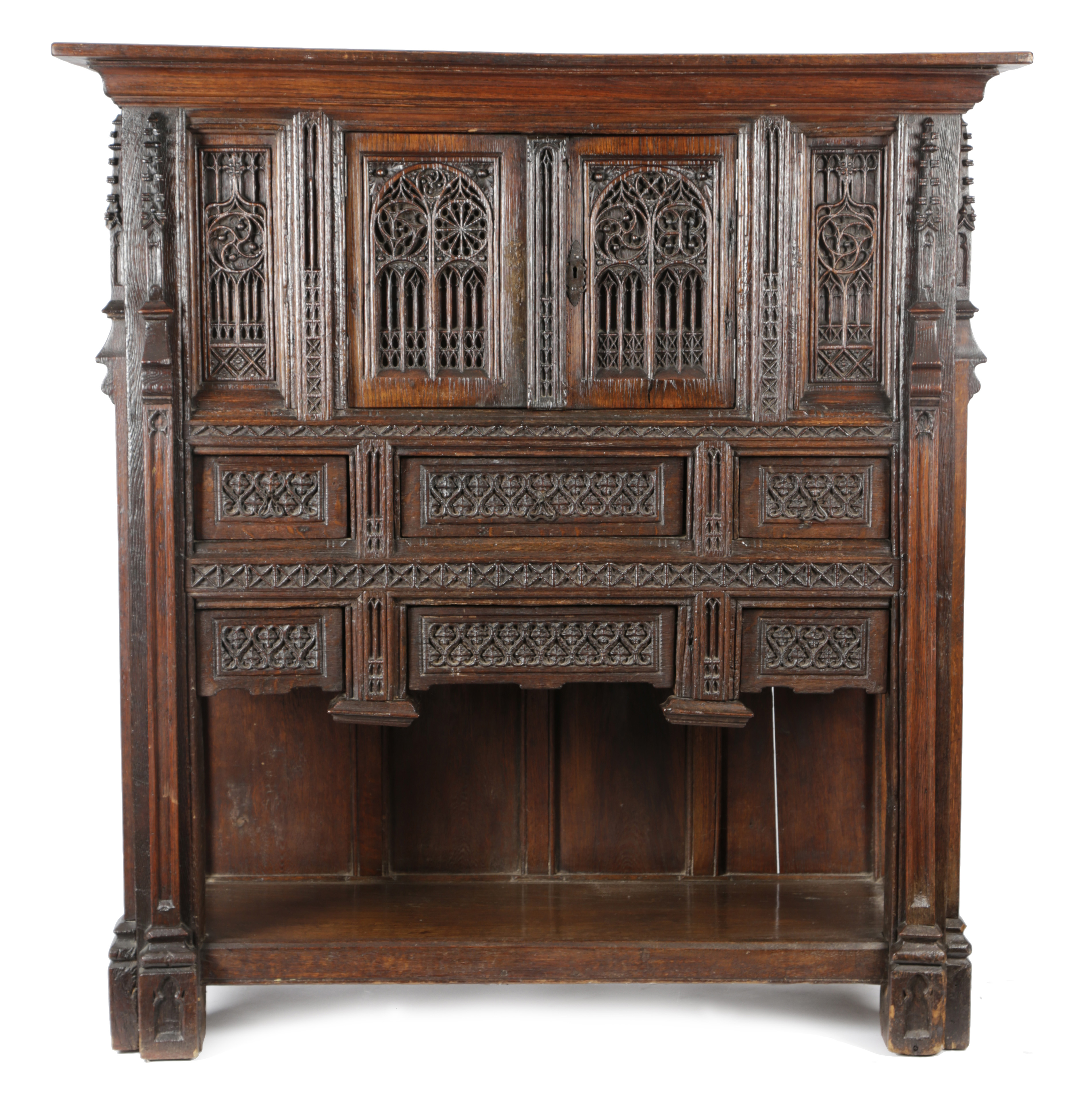 inset with four Gothic tracery panels decorated with whorls, with a pair of doors above six drawers, the corners with crockets