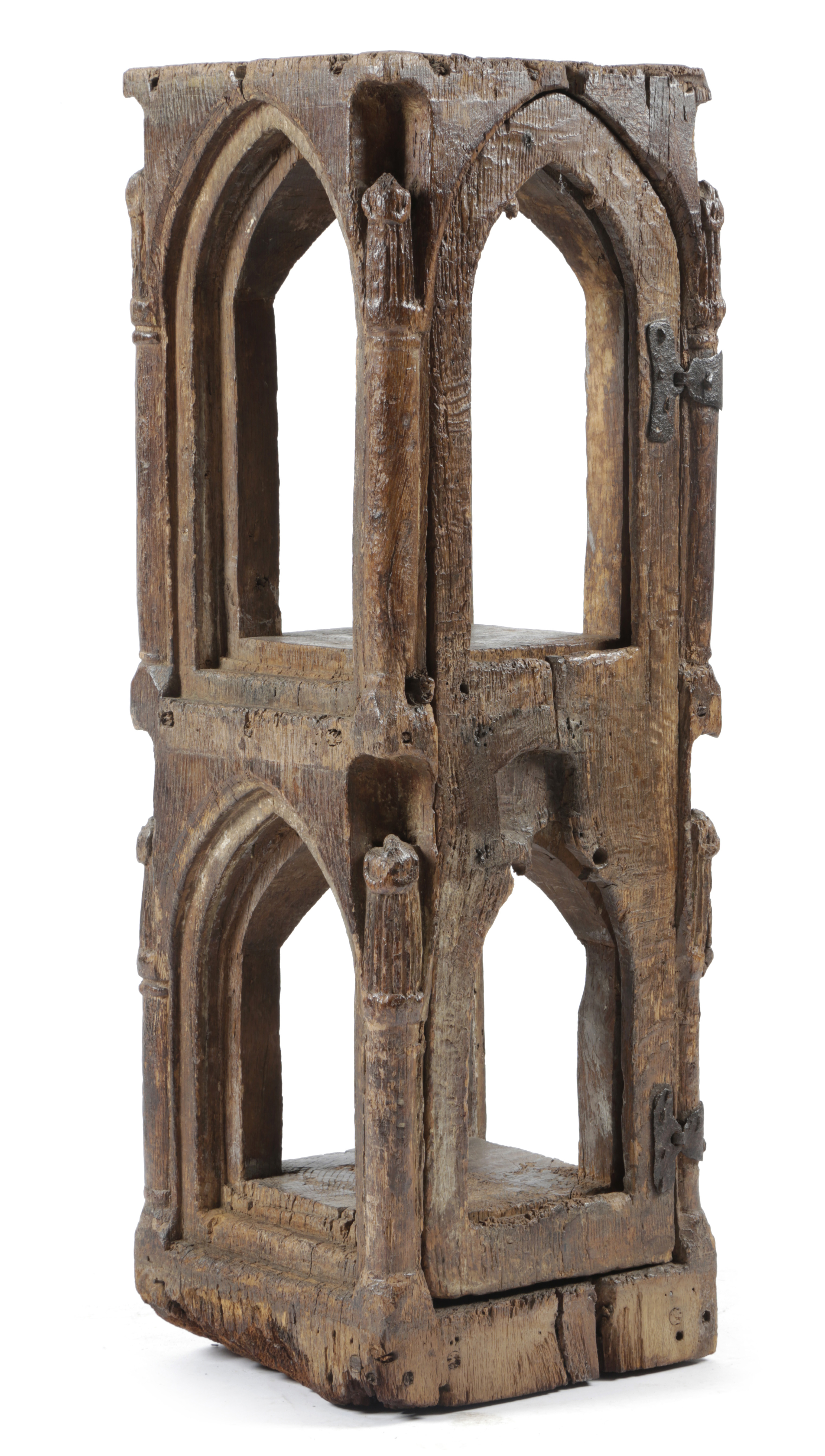 of column form, designed as two tiers, with open Gothic lancet arches to all sides, the front with a single hinged door, the corners with turned columns surmounted by robed saints, with remnants of open tracery