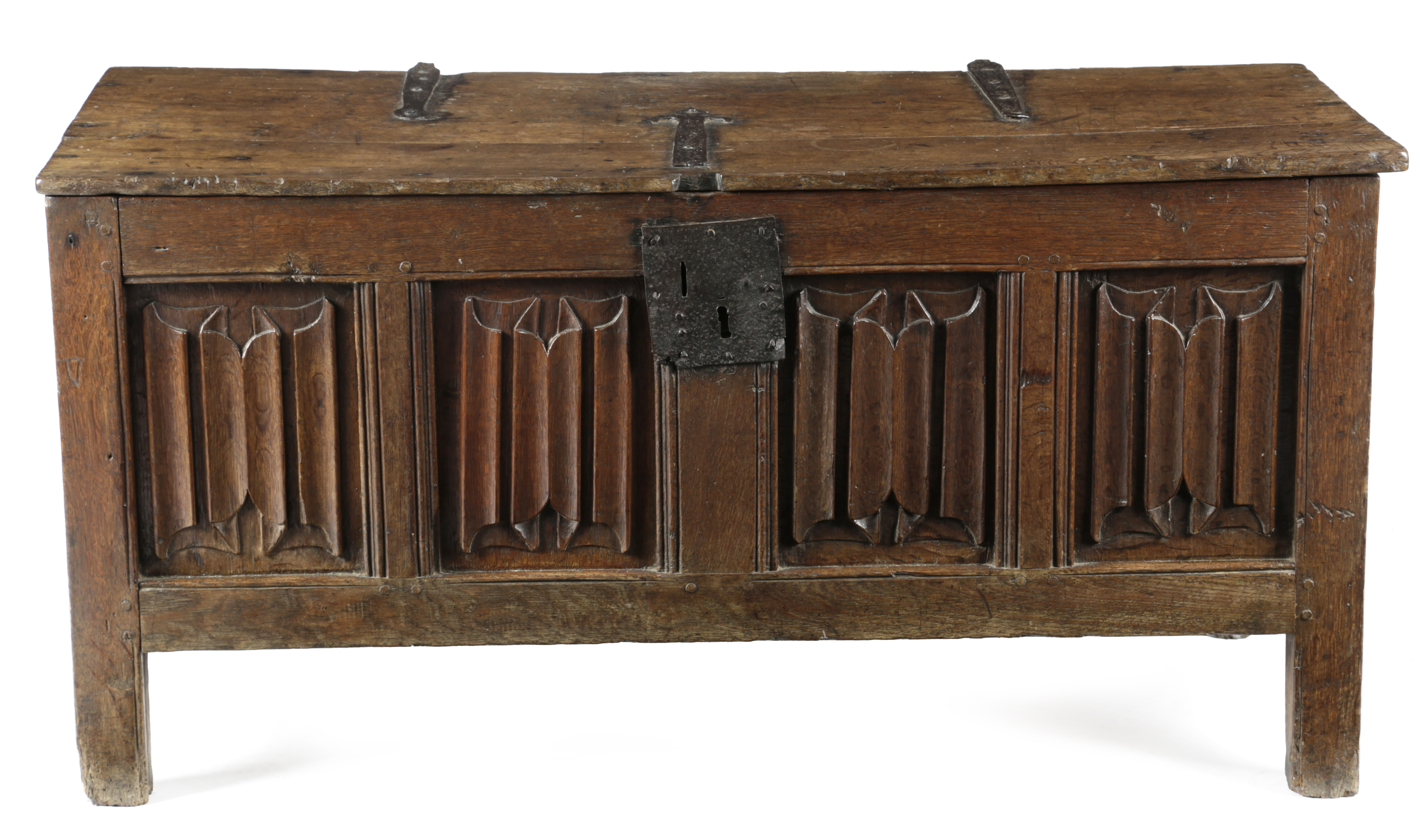 the twin-plank top with iron hinges, above a quadruple panelled front, each panel deeply carved with linenfold