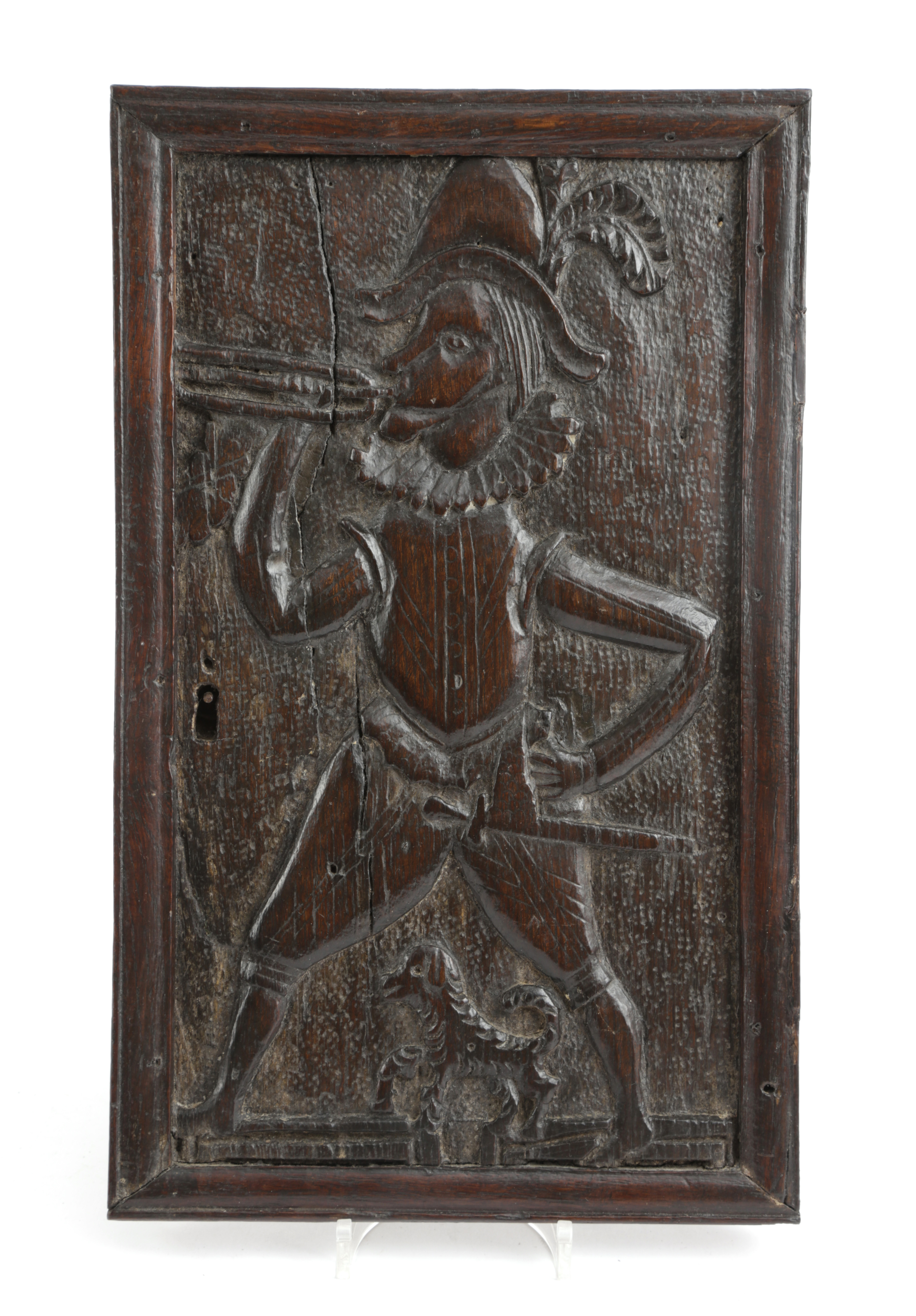 carved with a man playing a horn, wearing a feathered hat, a ruff and doublet, a sword across his hose, a talbot hound between his legs, previously fitted as a door