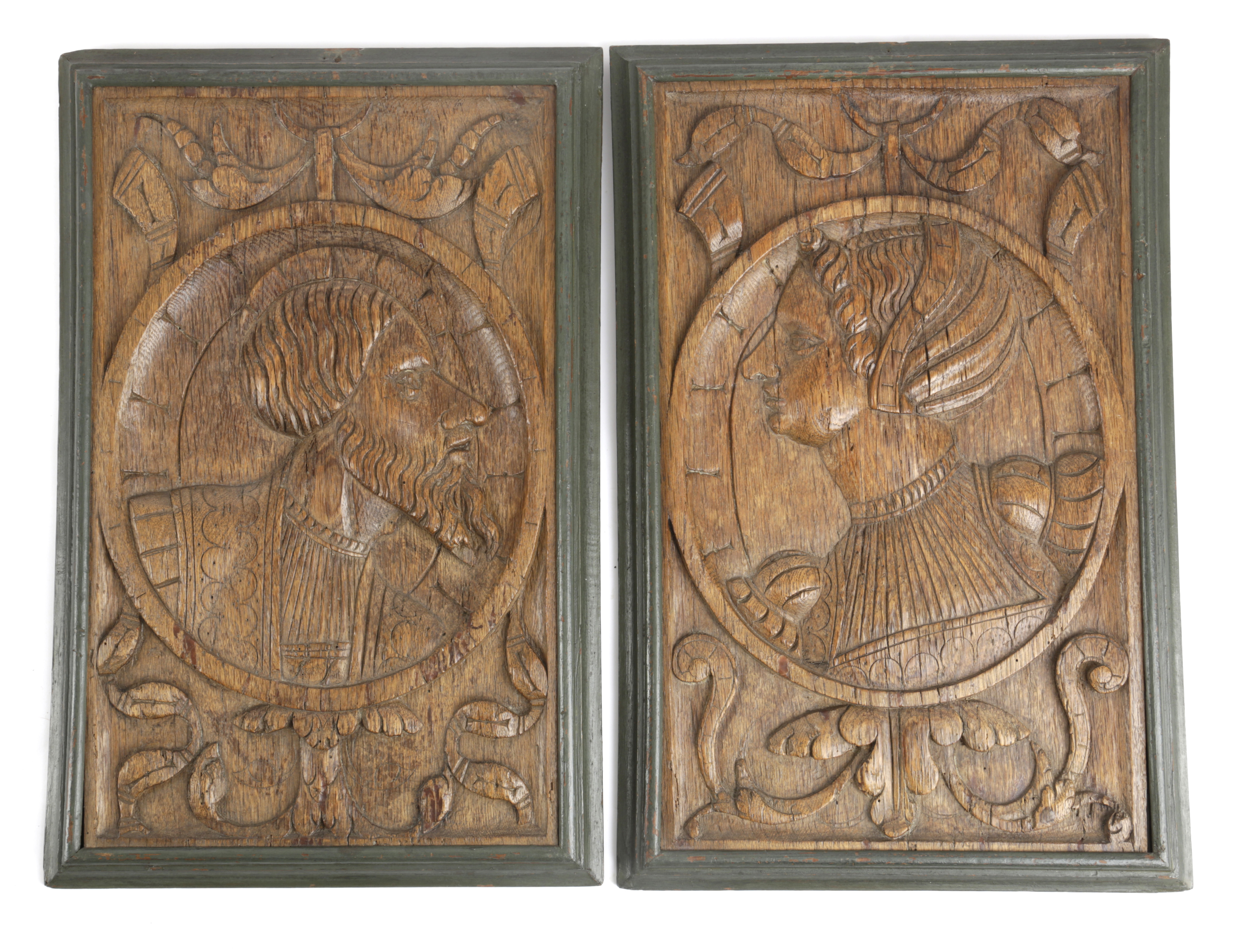 A PAIR OF HENRY VIII OAK ROMAYNE-TYPE PORTRAIT PANELS