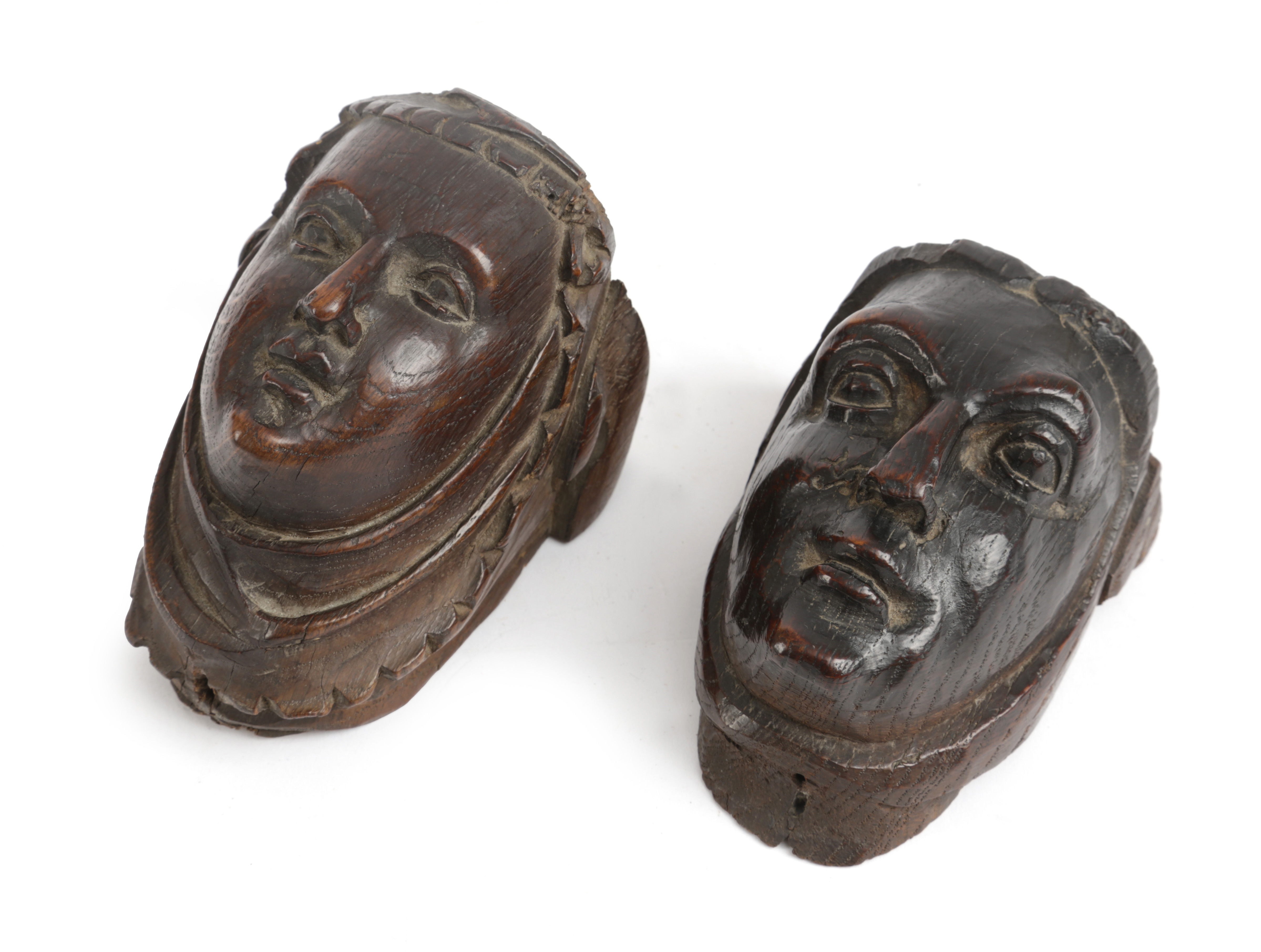 TWO SMALL 15TH CENTURY OAK PORTRAIT CORBELS