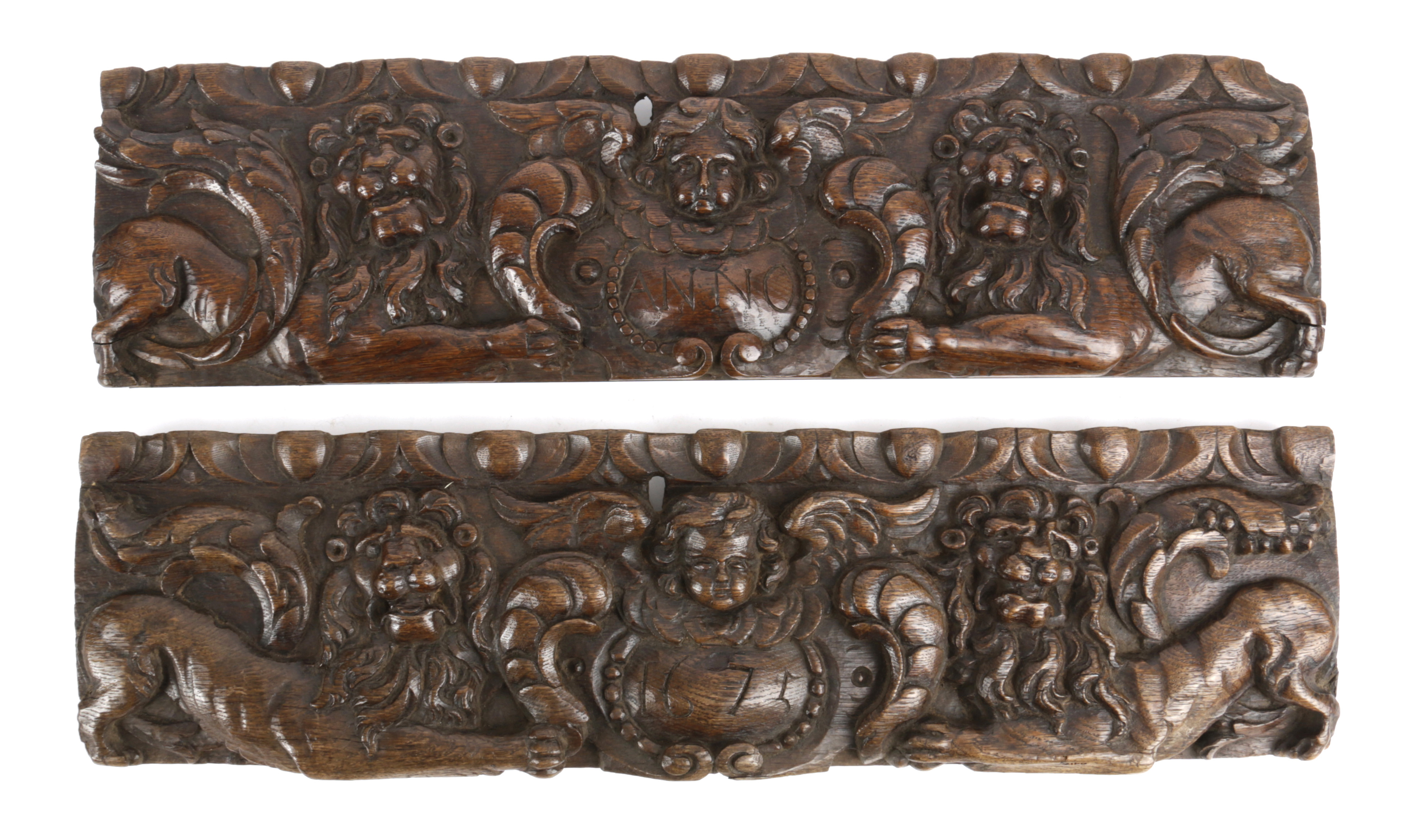 each relief carved with a pair of lions flanking an angel's mask and inscribed cartouches 'anno 1675', formerly drawer fronts (2)