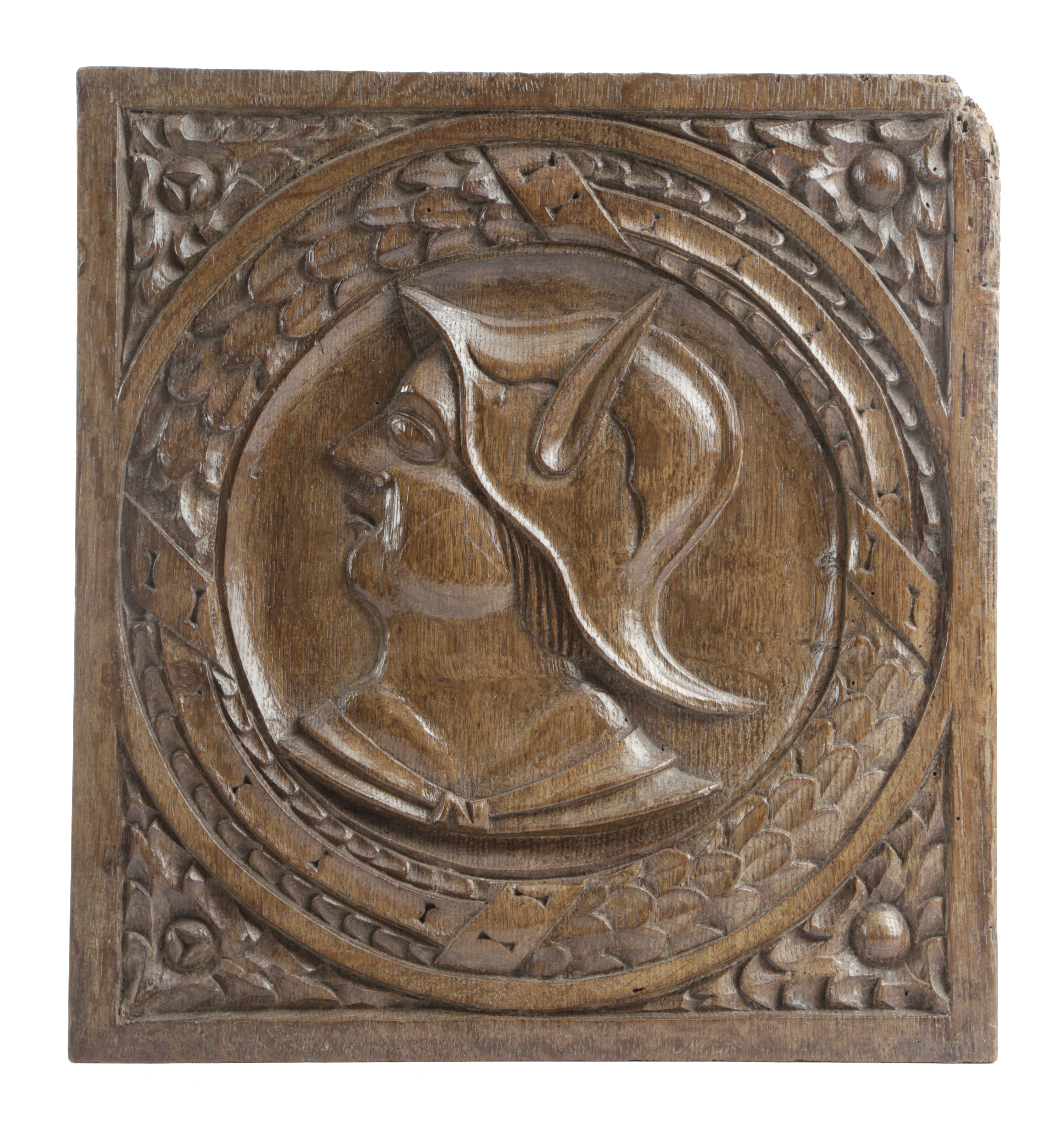A HENRY VIII CARVED OAK ROMAYNE-TYPE PANEL