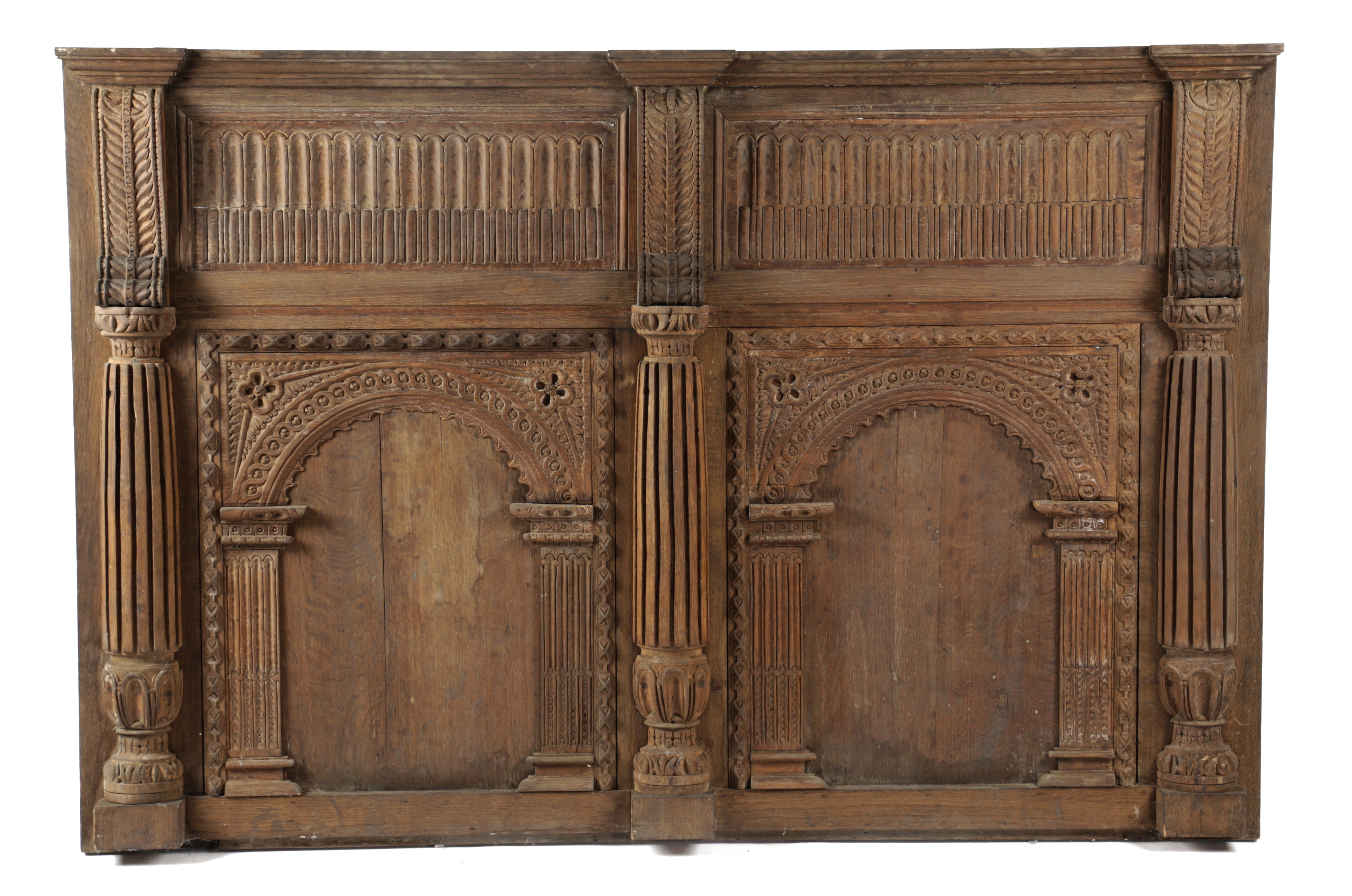 formed from two nulled panels spaced by stiff leaf corbels, above a pair of arched panels flanked by leaf carved corbels and ribbed pilasters