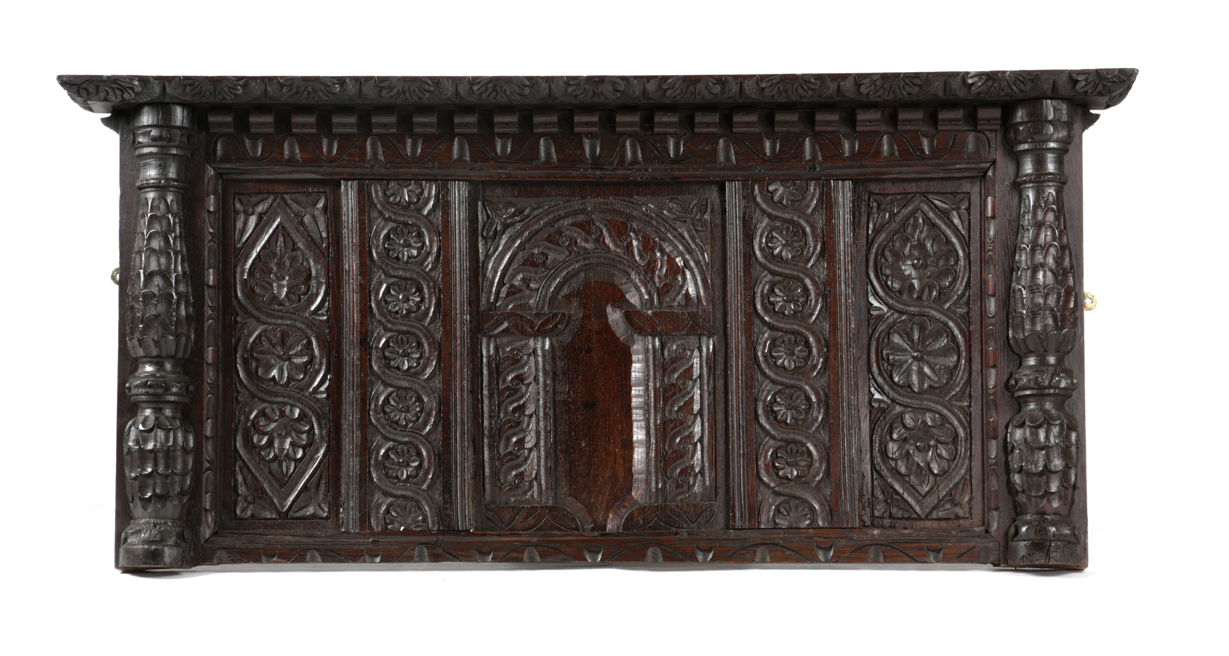 historically constructed in part from a period coffer front, the central panel carved with a guilloche filled arch, flanked by flowerhead guilloche carved uprights, and slender floral interlaced carved panels, below a dentil moulded shelf, the whole with end gauge carved split pilasters