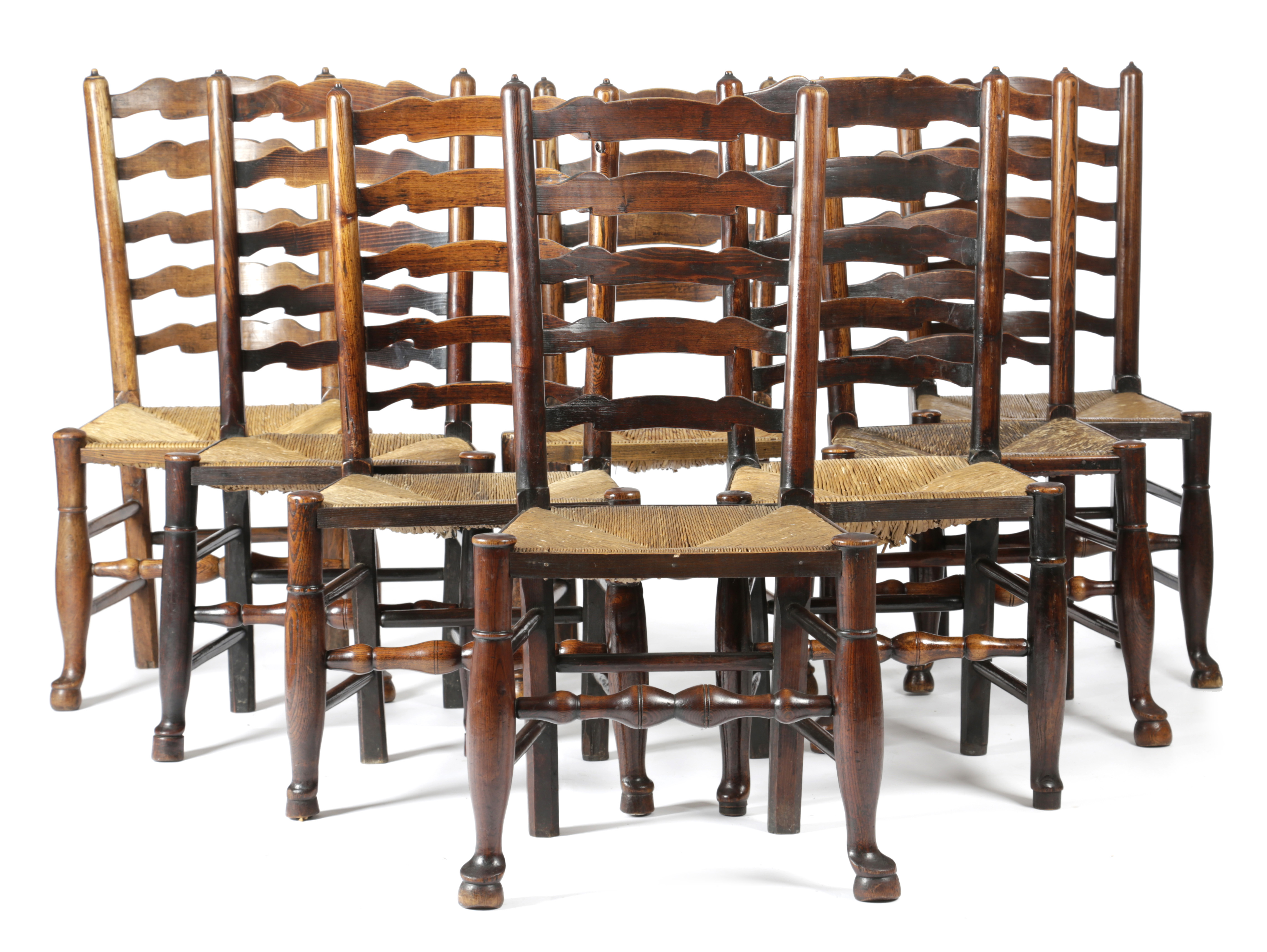 A HARLEQUIN SET OF EIGHT ASH LADDER BACK DINING CHAIRS