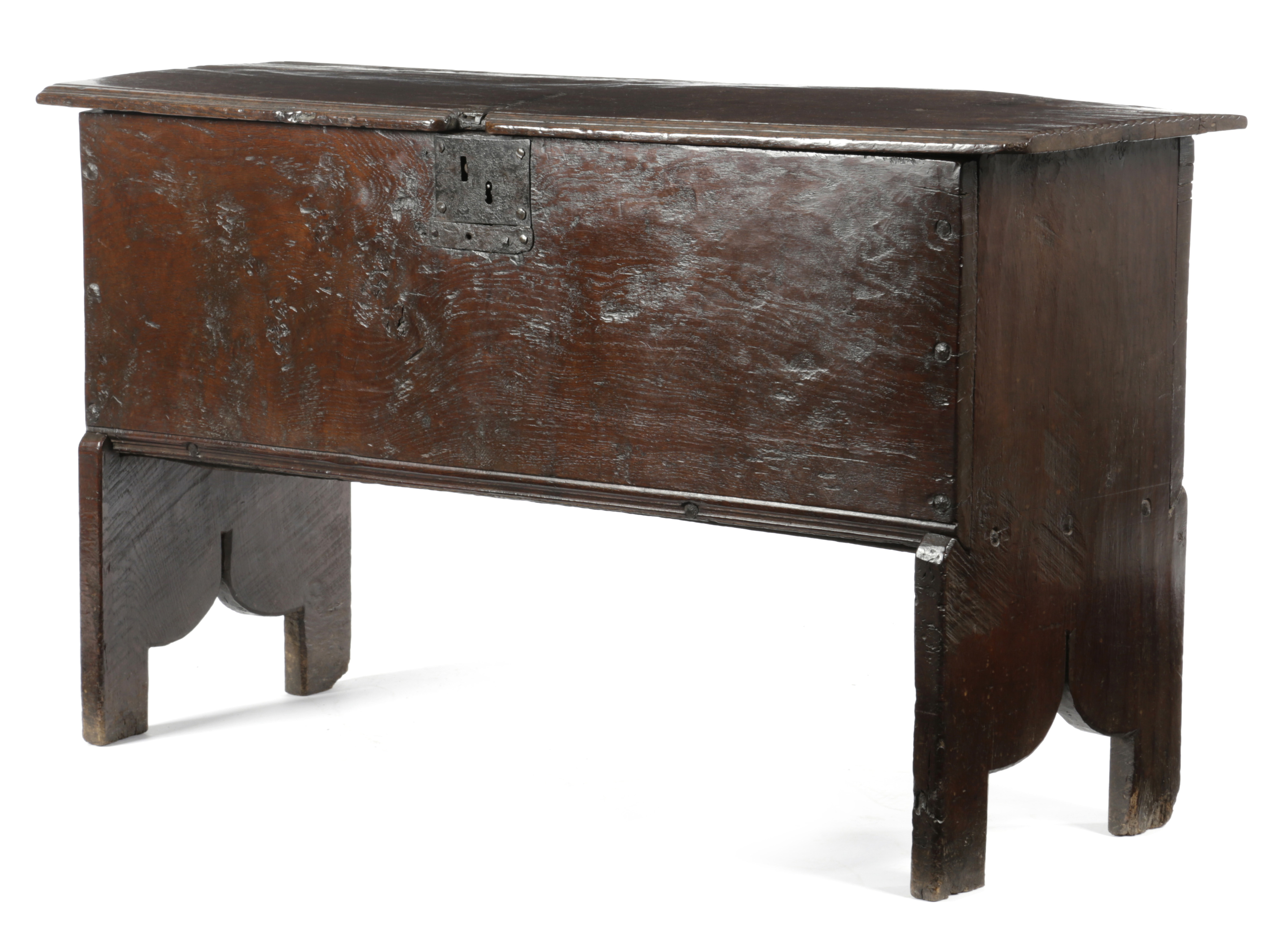 constructed using one-piece thick boards, the lid with a moulded front edge and chip-carved ends, the lower corners of the front and rear boards cut into the end supports which project below the base board and terminate in a 'V' shaped cut-away with high apex detail