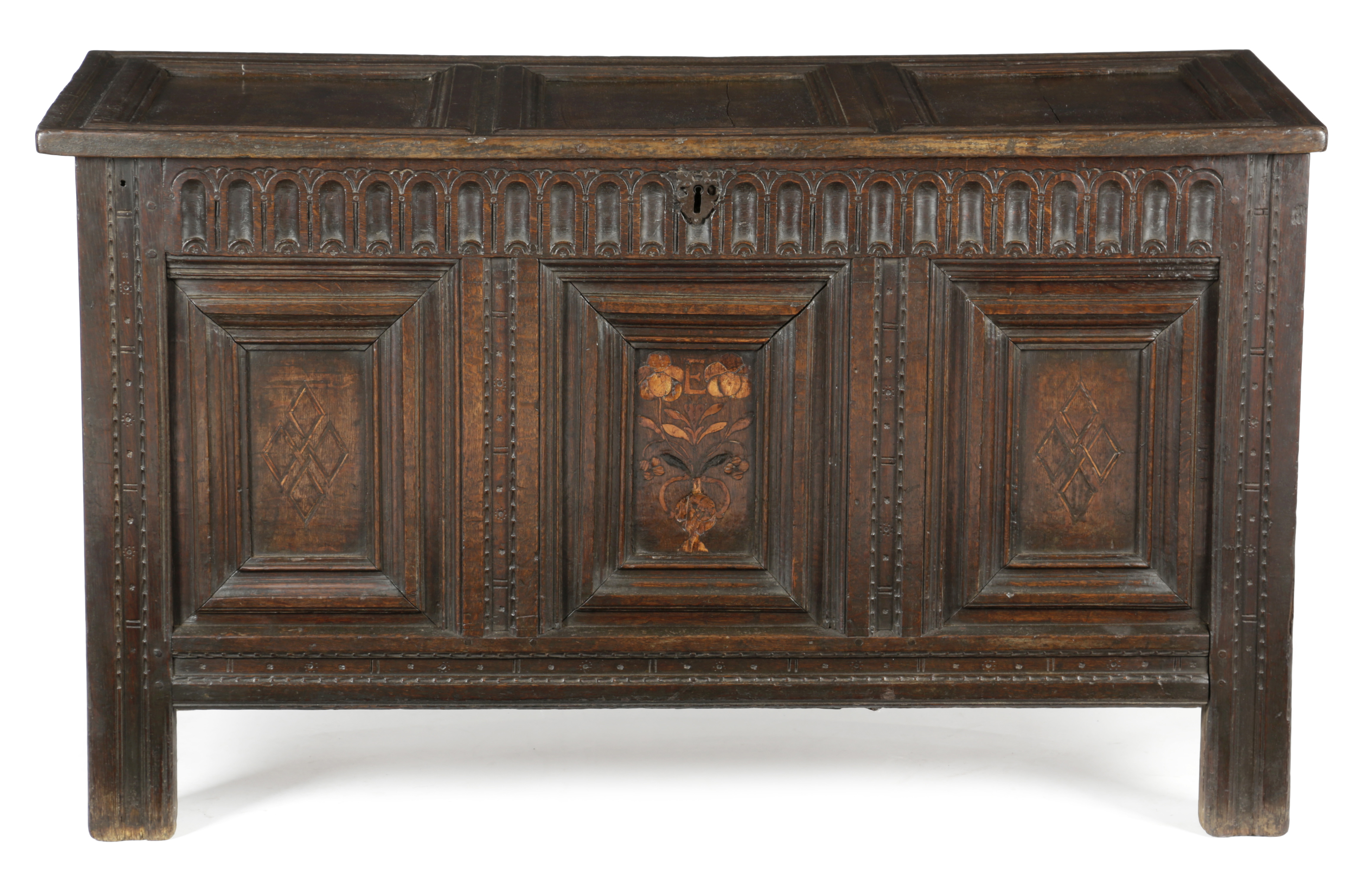 AN ELIZABETH I JOINED OAK AND MARQUETRY INLAID COFFER