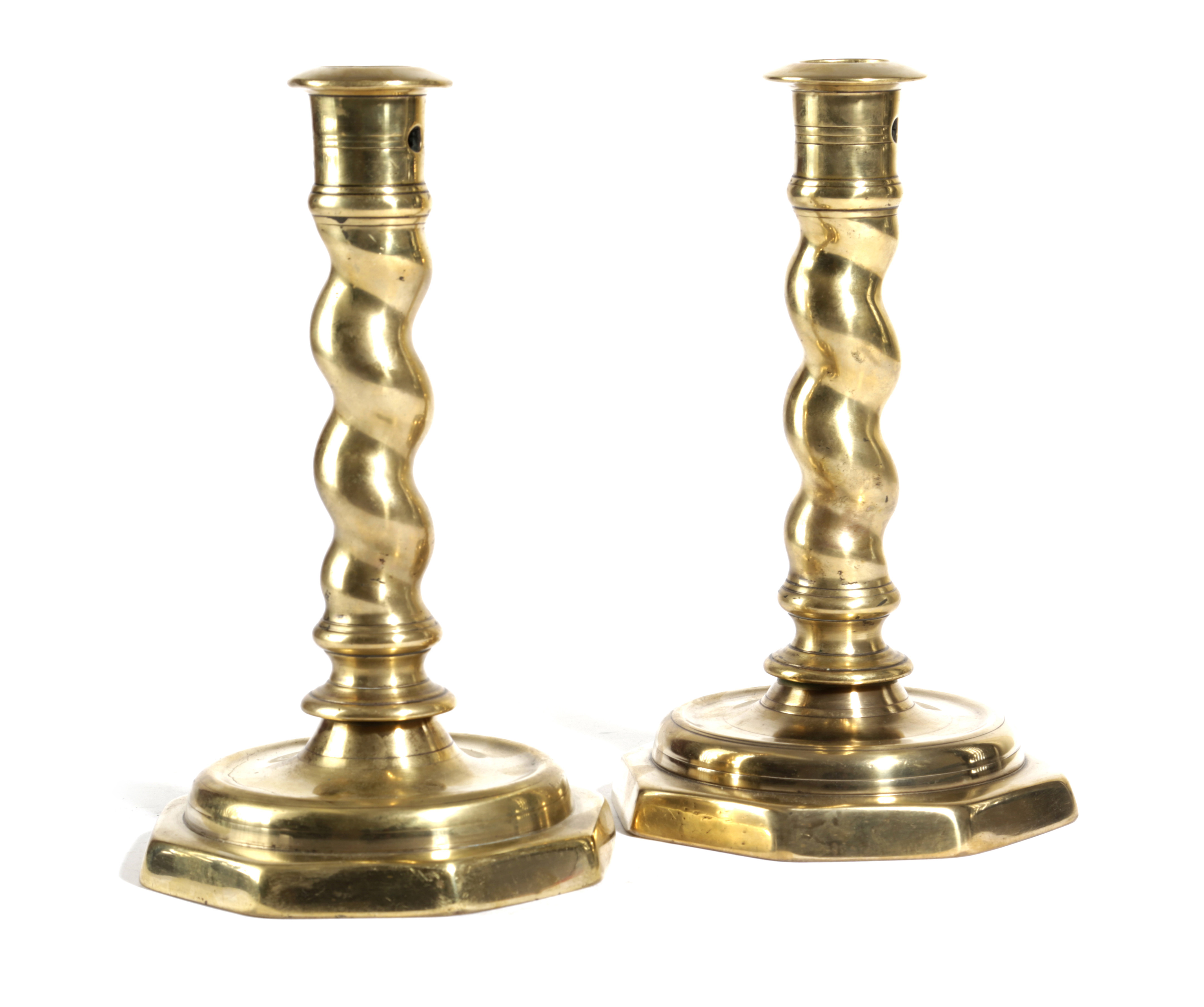 each heavily cast, having a Solomonic pillar, a cylindrical socket with circular pierced extraction hole and a downswept flange, on a stepped circular dished and octagonal foot (2)