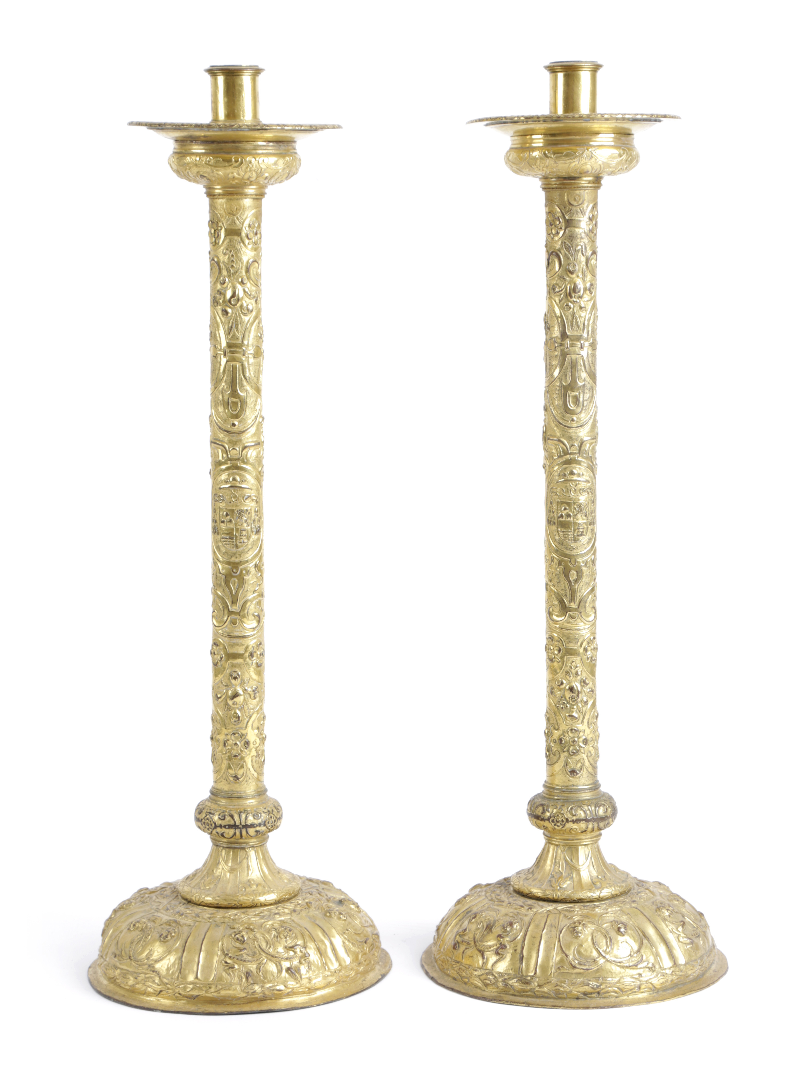 each with a cylindrical socket above an urn shaped drip-pan, cylindrical column and domed foot, embossed with a coat of arms surrounded by Renaissance style strapwork and foliage (2)