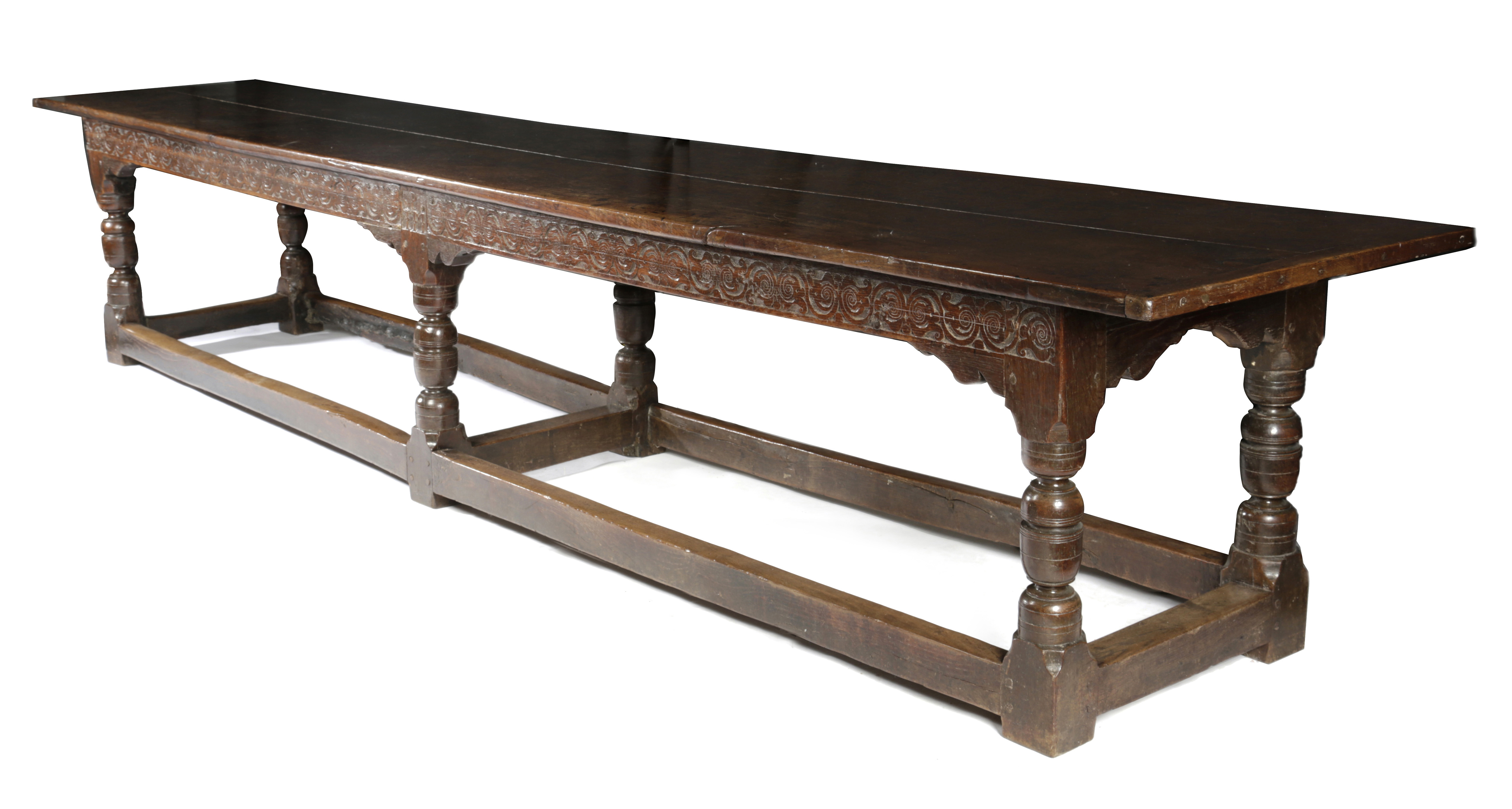 with a highly impressive matching two-board top, with cleated ends, the frieze carved with Trough of Bowland regional tightly-curled scrolls, centred by the marriage initials ‘IP’ over ‘MP’, all remaining frieze rails channel run moulded and with integral scroll profiled spandrels, on six cup and cover bulbous turned legs, joined by robust rectangular section peripheral stretchers and a central cross stretcher, an inscribed line at the right hand end of the top indicated former use as a shuffleboard, along with the indication of a catch box