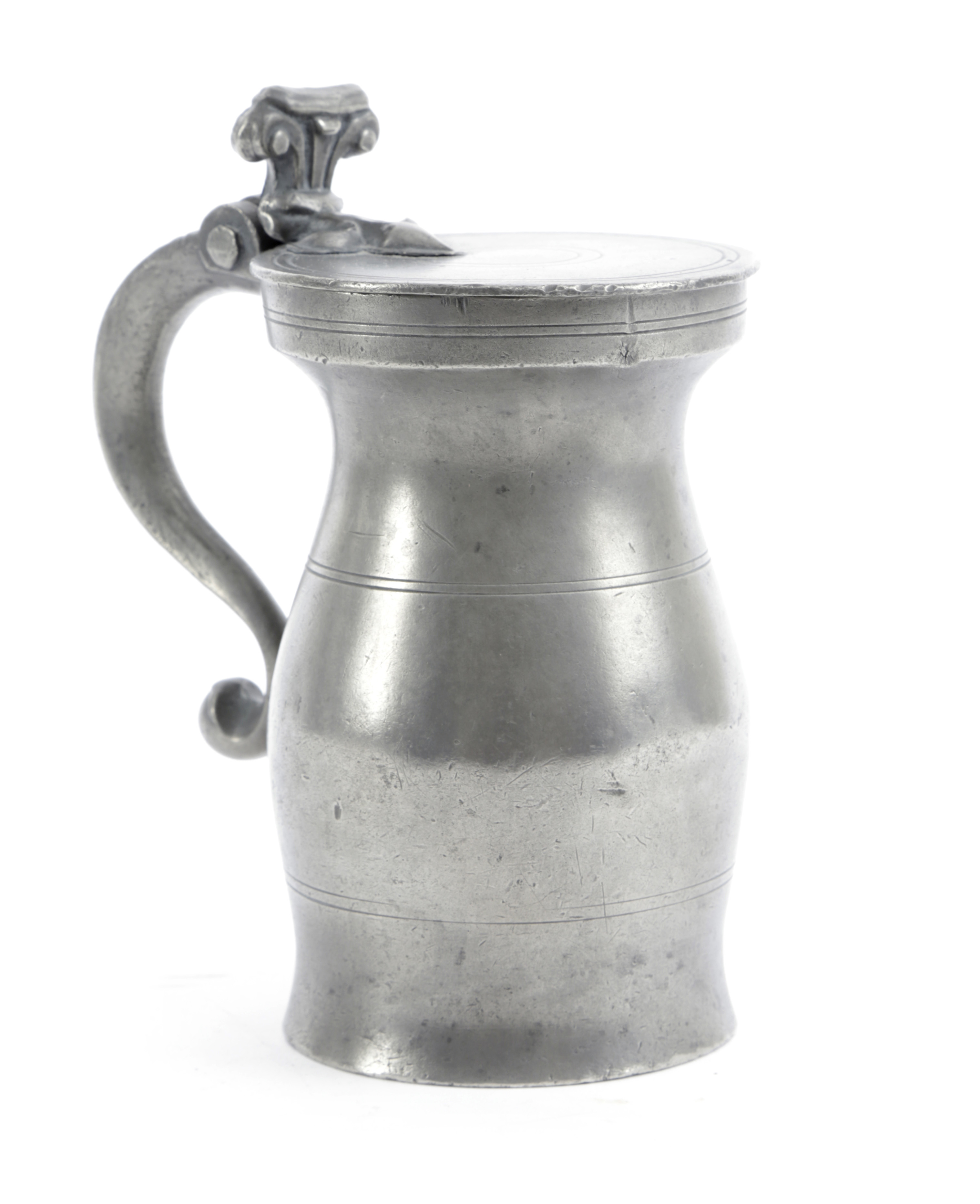 A GEORGE III PEWTER DOUBLE-VOLUTE BALUSTER PINT MEASURE