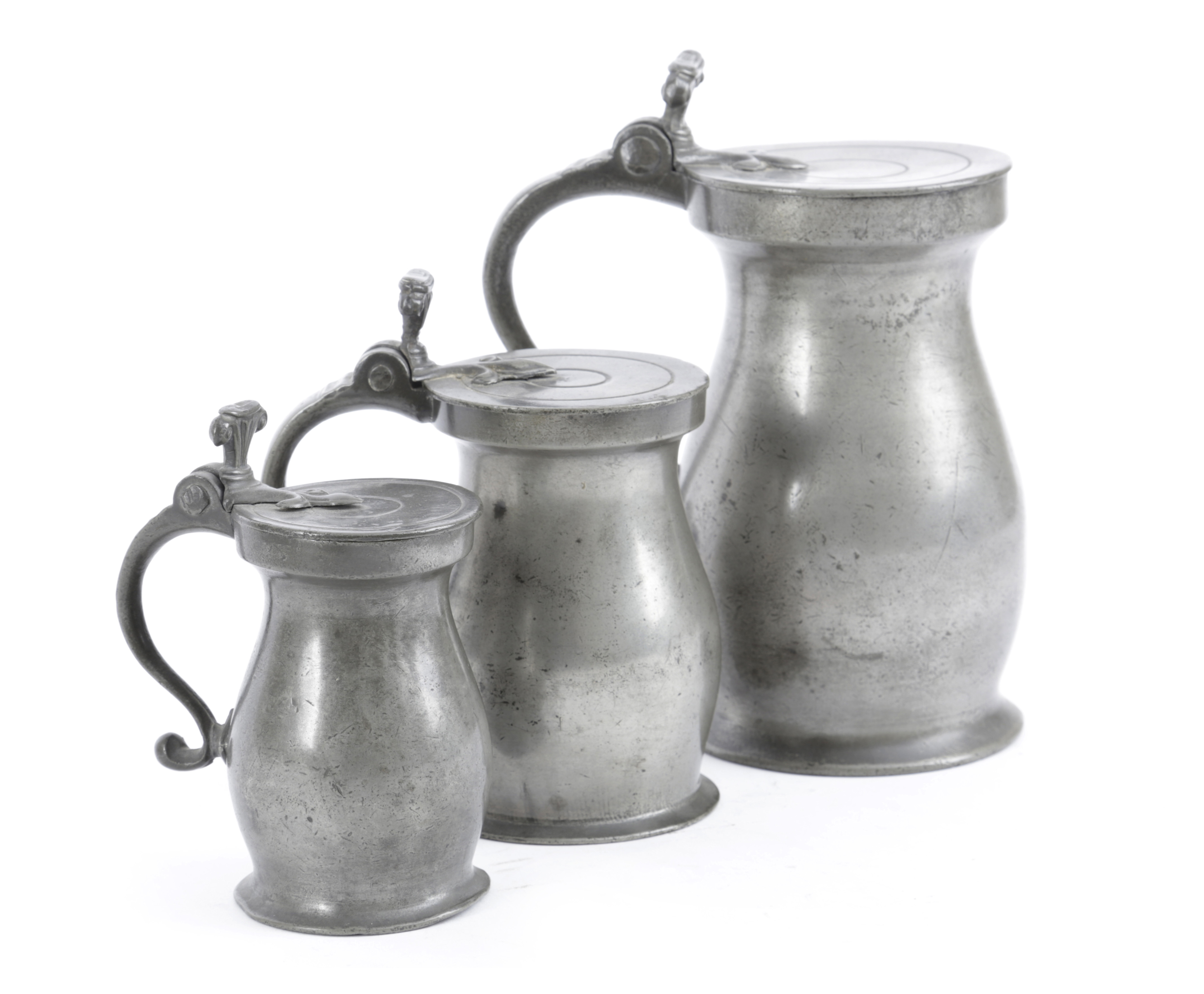 A GRADUATED SET OF THREE GEORGE II PEWTER DOUBLE-VOLUTE BALUSTER MEASURES