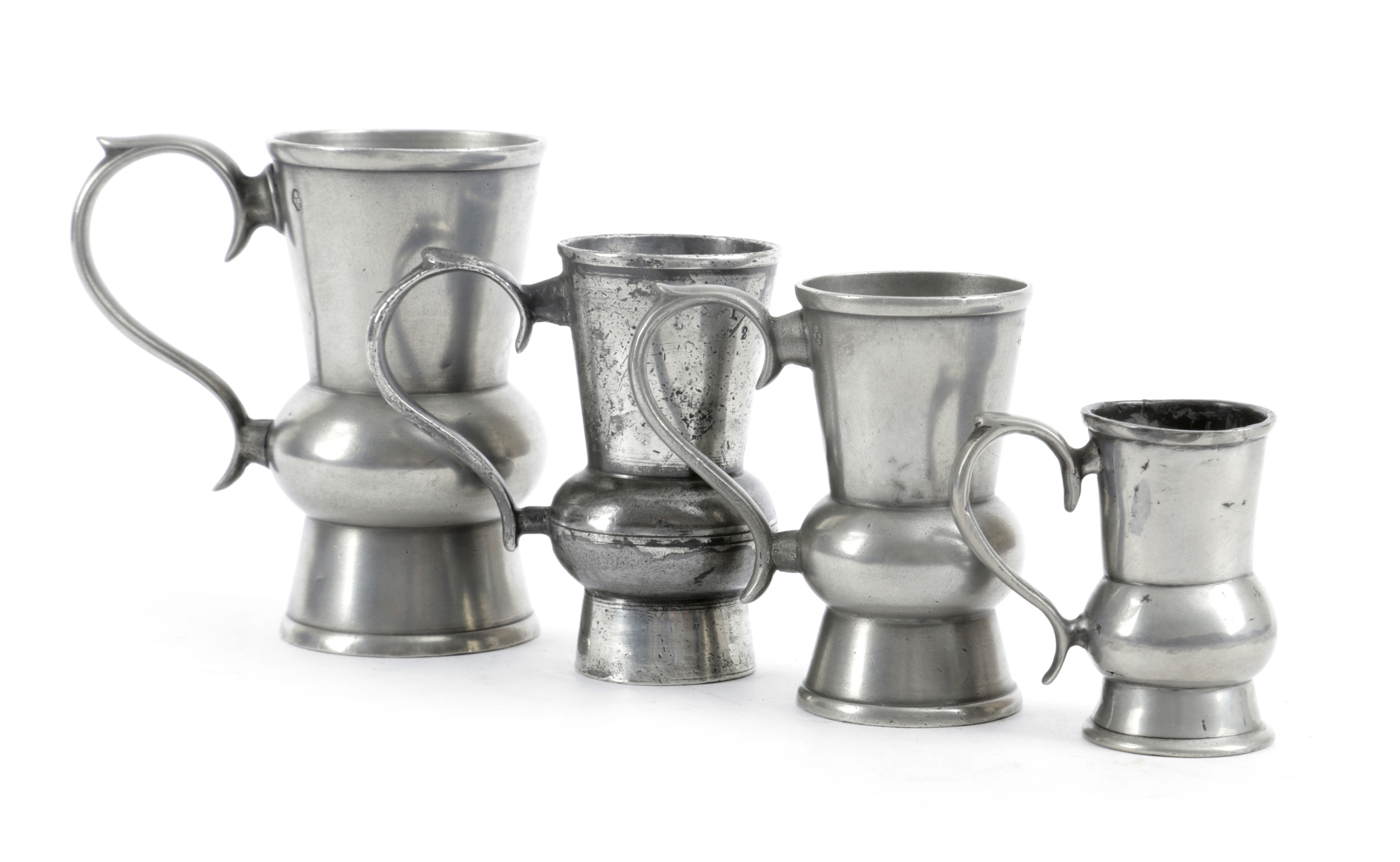 gill to ¼ gill, some with maker's marks, each with a capacity label to the body, the gill and one ½-gill with two verification marks, the other half gill with a thistle mark and owner's initials 'HM' to the front, each with an 'S'-curve handle and a raised thumbrest (4)