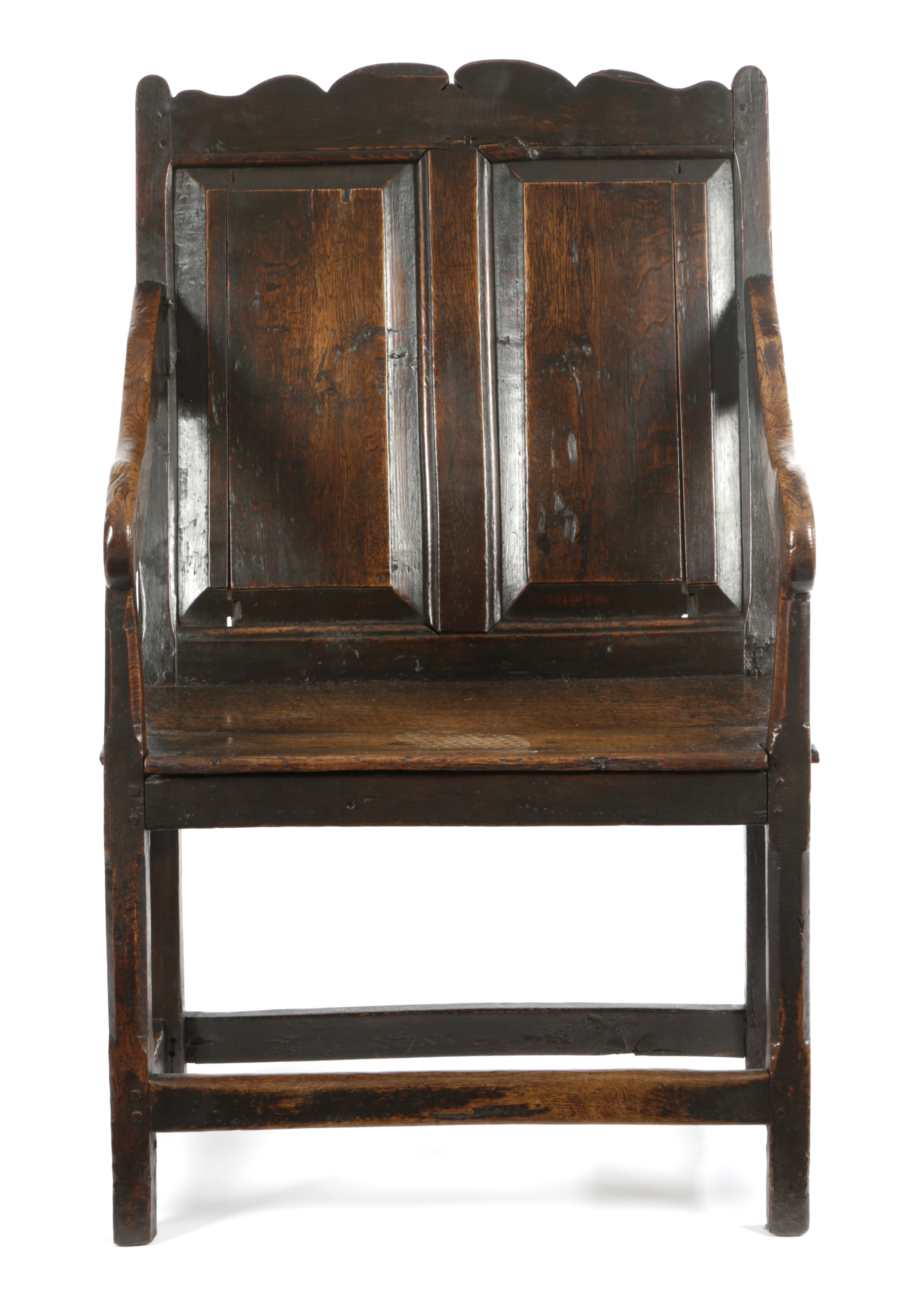 A WELSH OAK DOUBLE PANEL BACK OPEN ARMCHAIR
