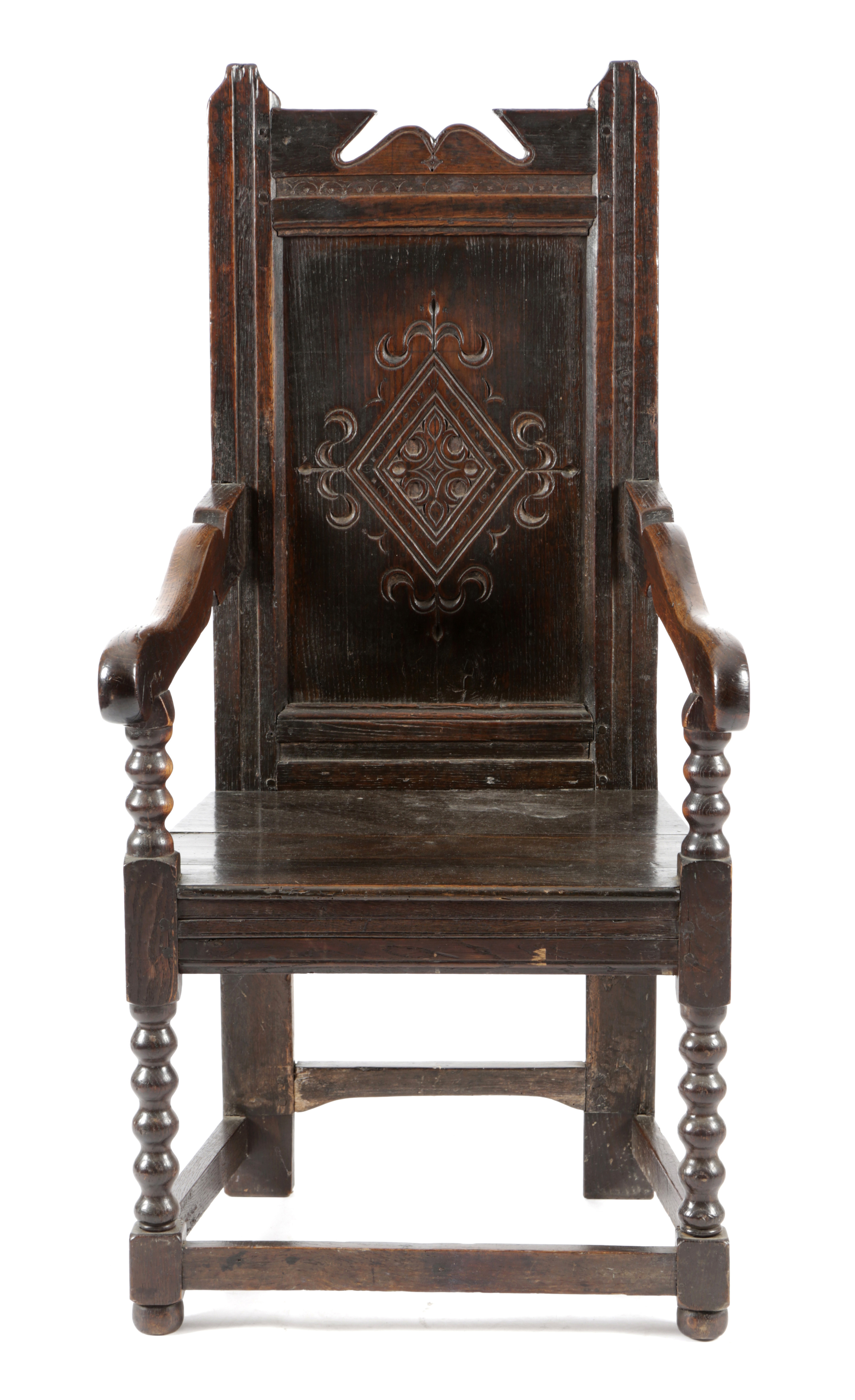 A CHARLES II OAK PANELLED BACK ARMCHAIR