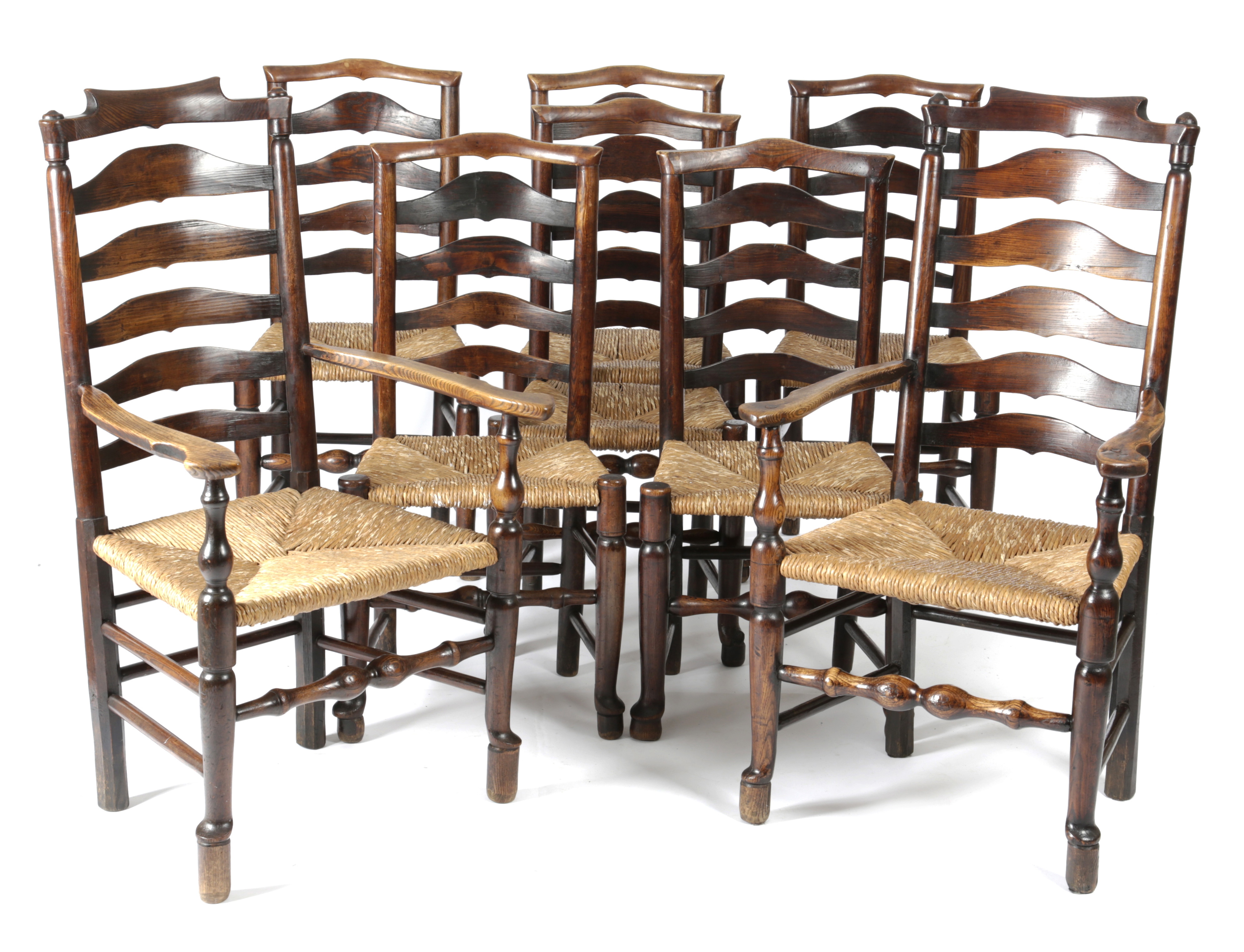 A SET OF EIGHT LANCASHIRE ASH AND ALDER LADDER BACK DINING CHAIRS