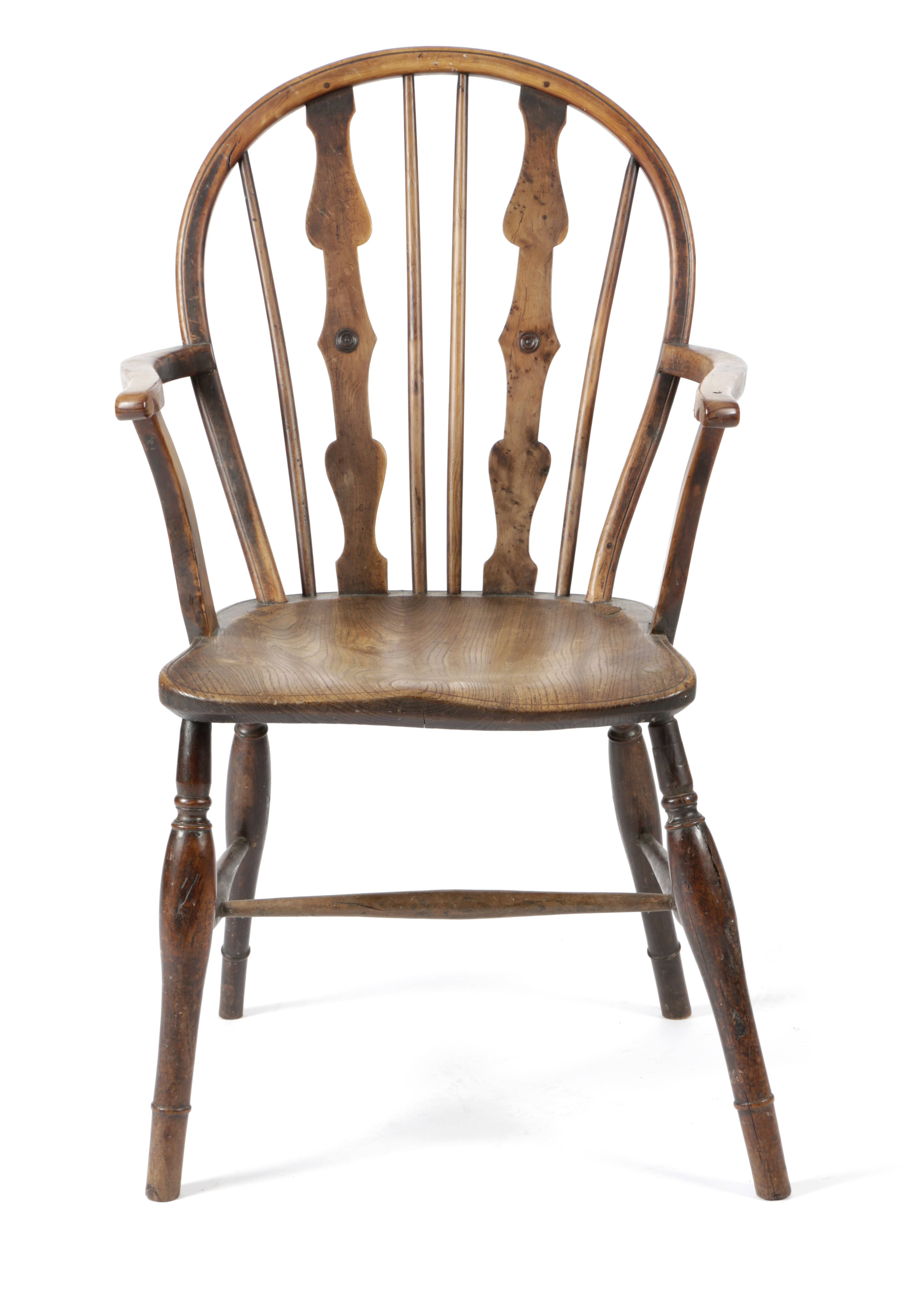 A LATE GEORGE III YEW LOW BACK WINDSOR ARMCHAIR