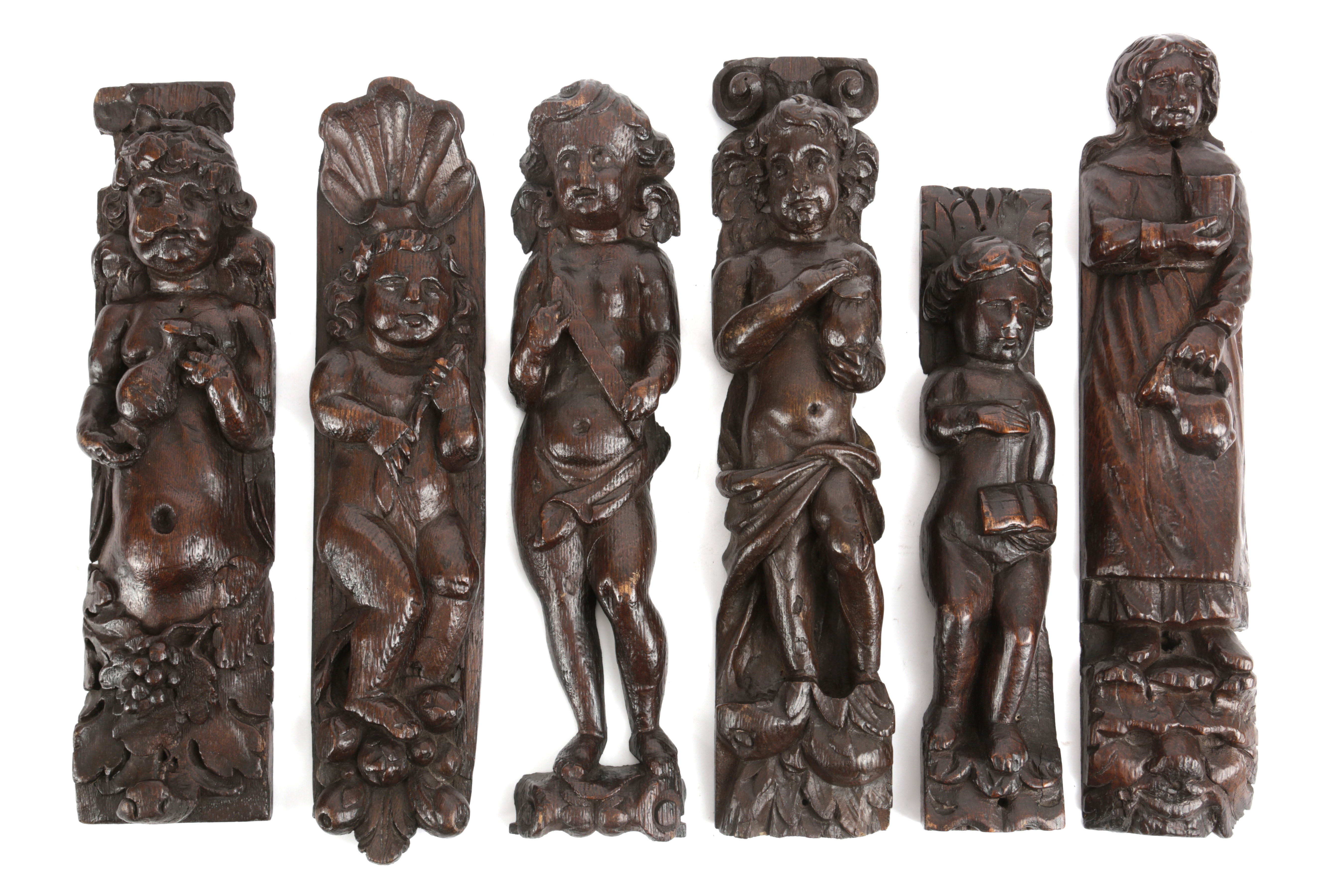 five carved with cherubs holding various objects together with a saint figure holding a jug and a beaker (6)