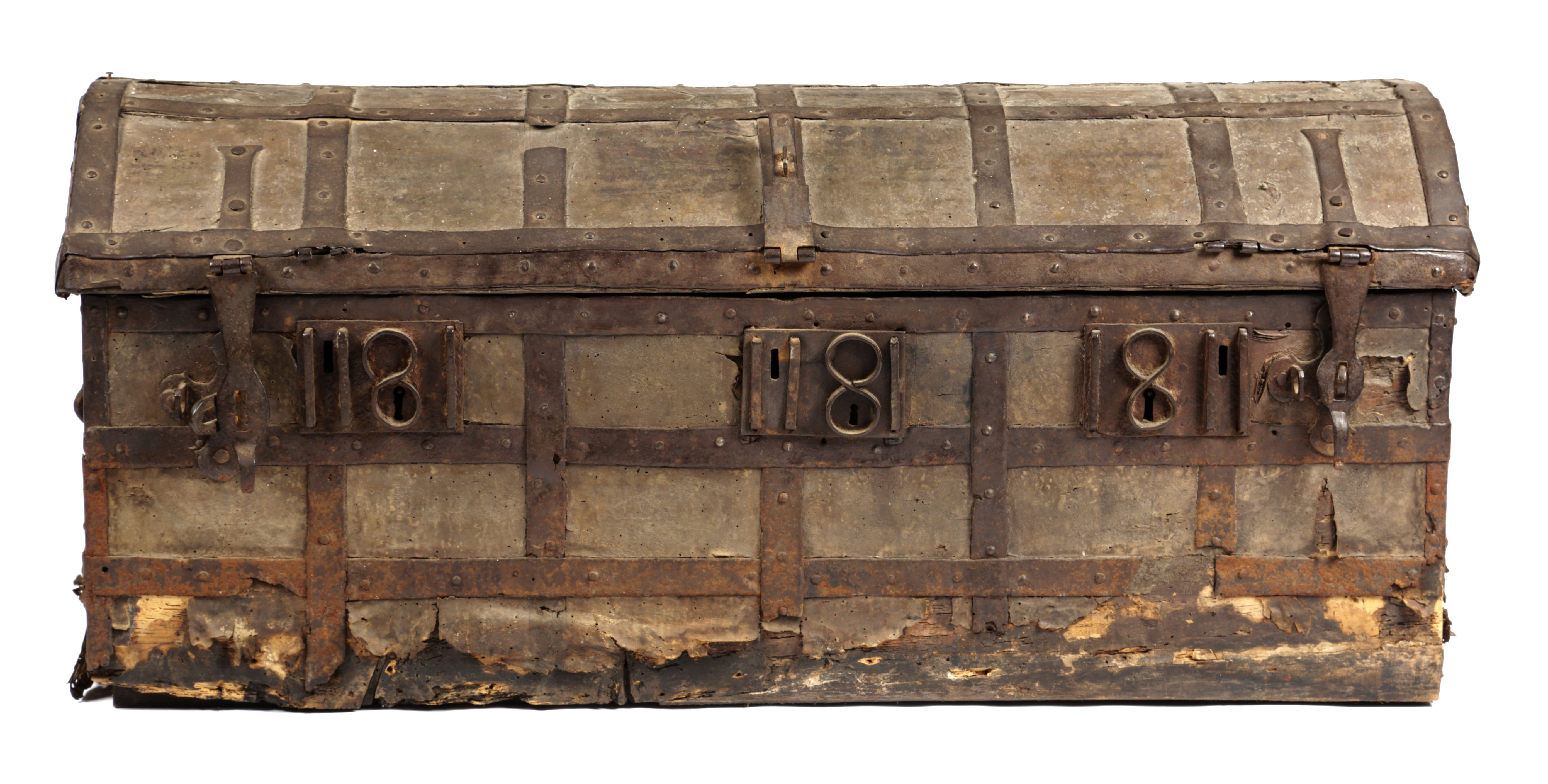 the hinged, domed cover enclosing a vacant interior, with three iron straps and lock plates and iron side carry handles