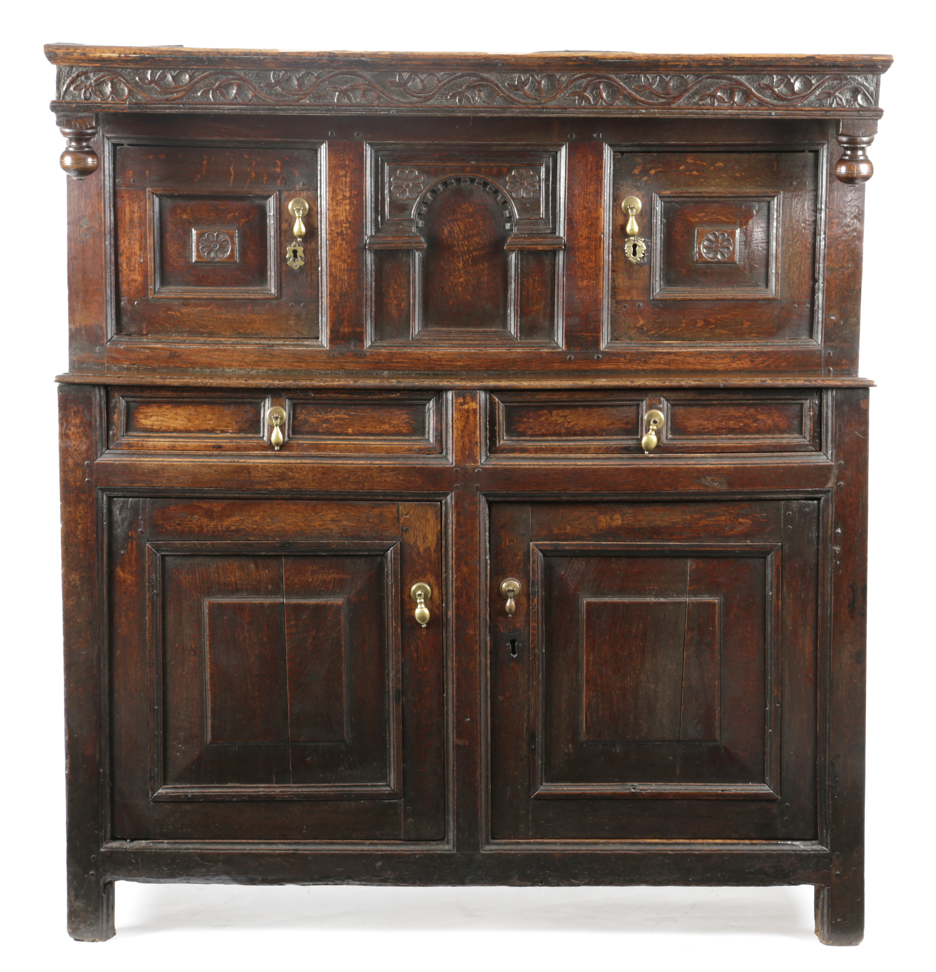 with carved floral meandering and pendant hung frieze, above a pair of flowerhead panelled cupboard doors, centred by a dentil arcaded fixed panel, the lower section with two drawers over a pair of fielded panelled cupboard doors, with panelled sides, typically in two parts, on extended stile supports