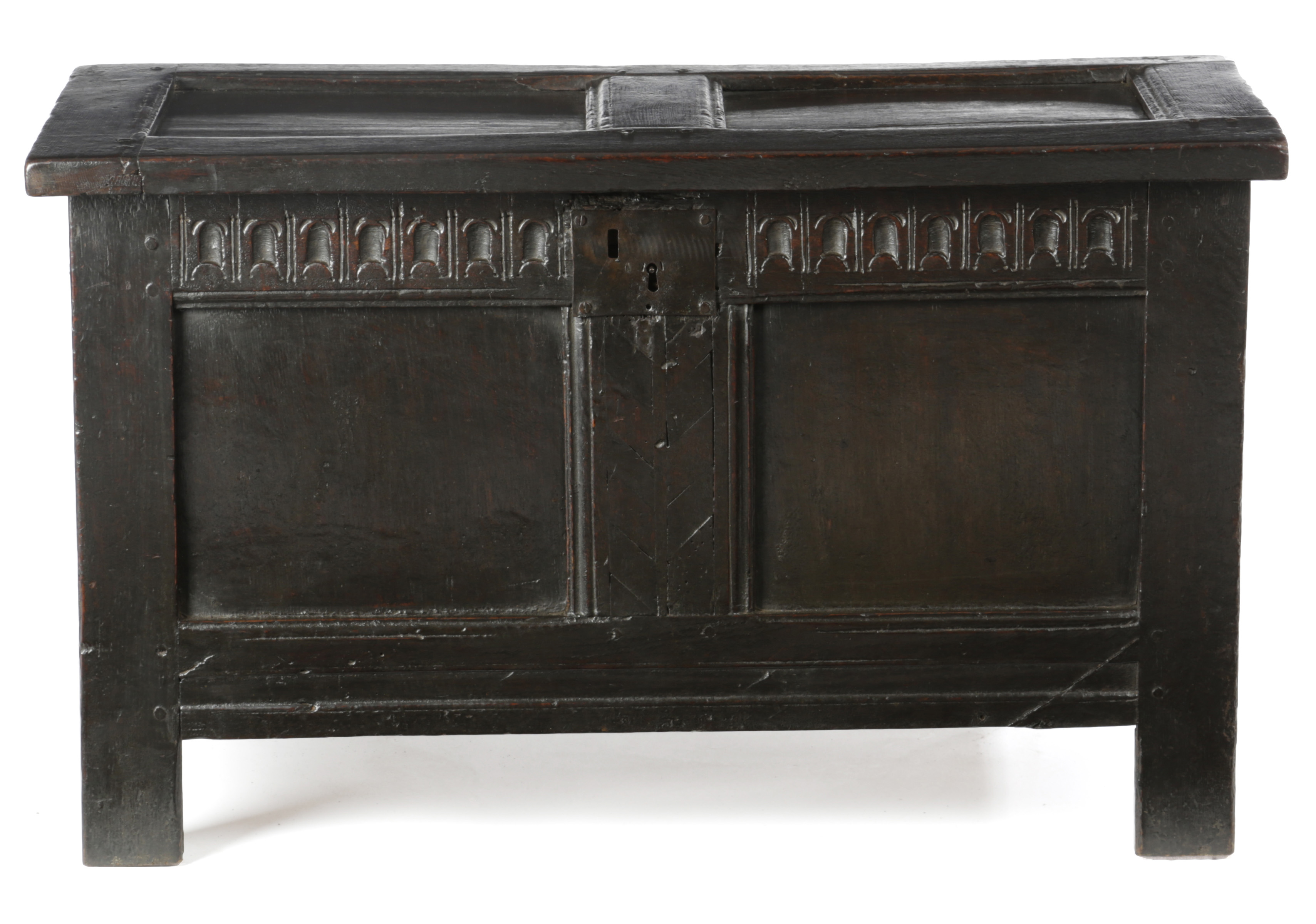 having a twin panelled lid, the front also with two panels below a nulled carved top rail and centred by a chequer inlaid muntin rail, the lower front rail and side rails each with broad run moulding, on extended stile supports