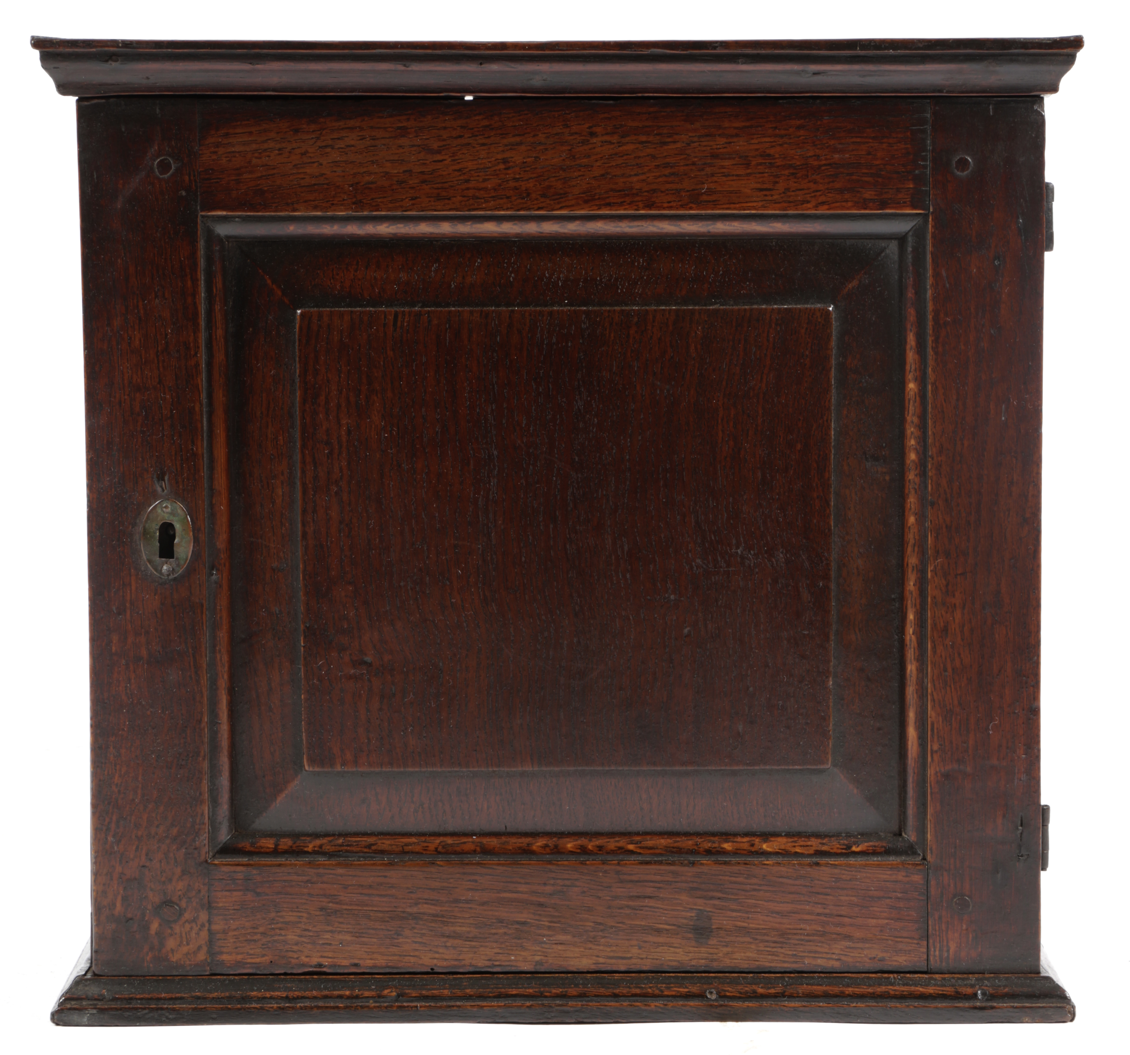 having a single fielded panelled cupboard door, enclosing a former fitted interior with one base drawer, with working lock and key