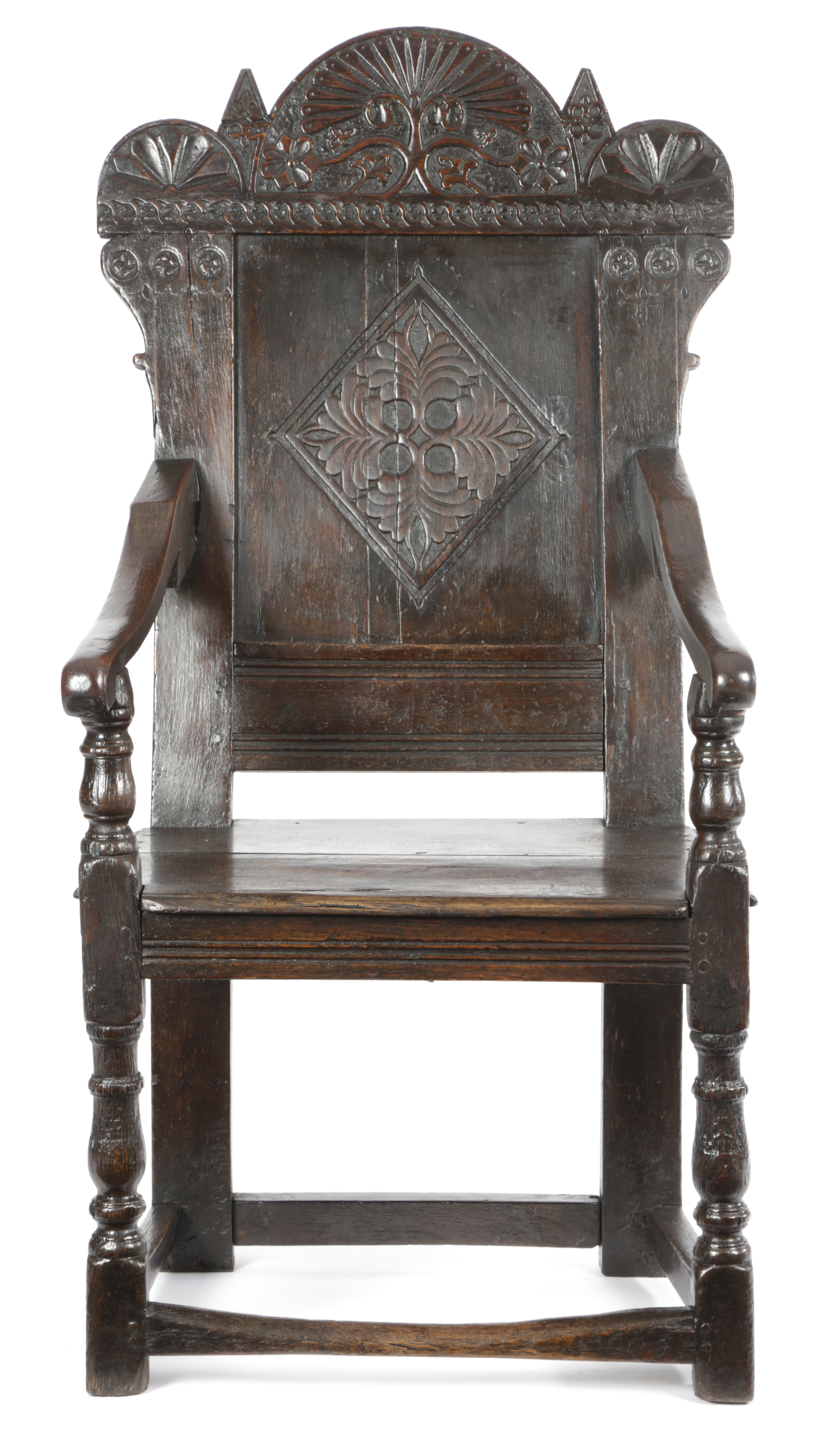 A RARE CHARLES II OAK SO-CALLED 'DURHAM' PANELLED BACK ARMCHAIR