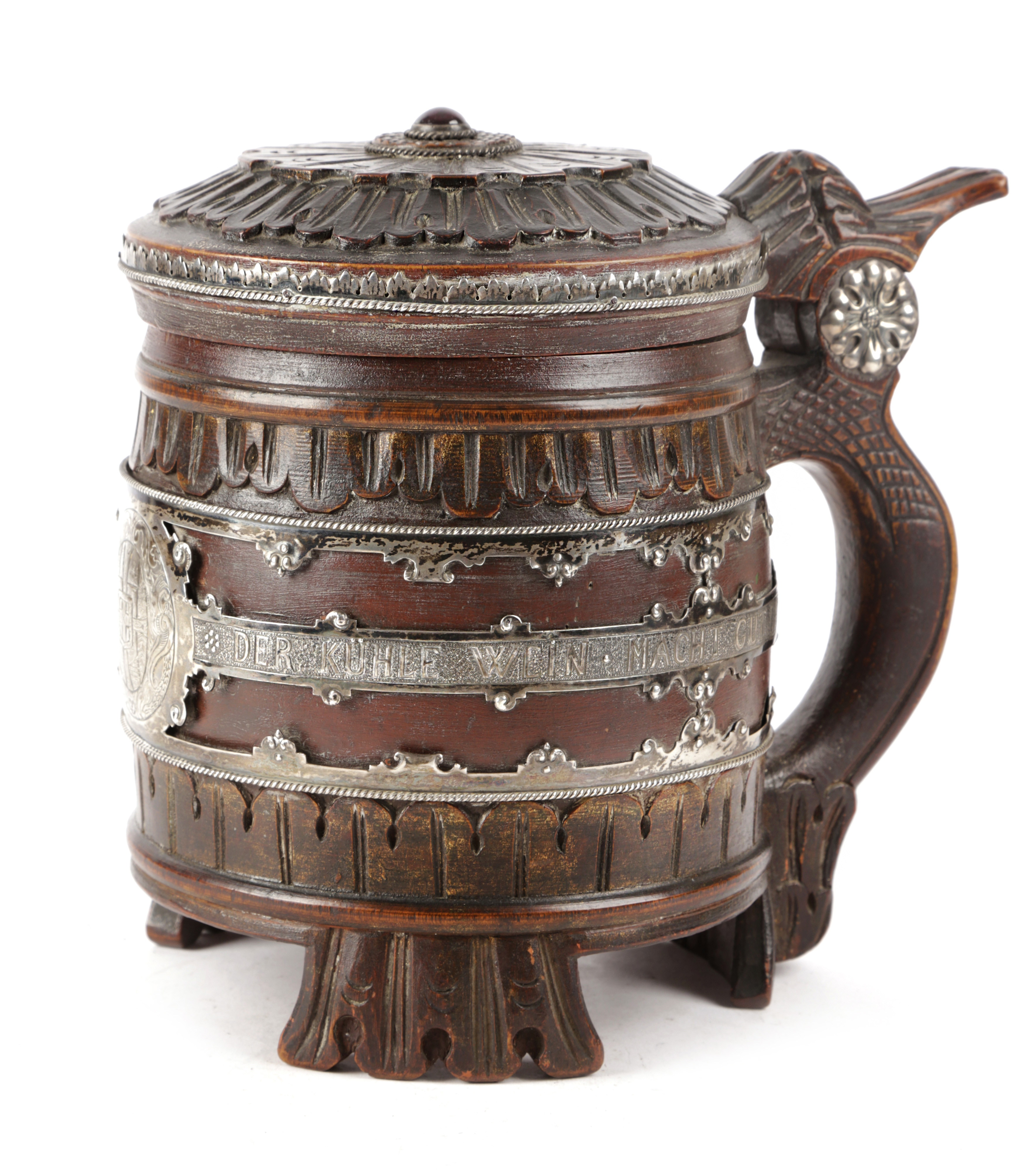the barrel shaped body with carved stylised foliate decoration above three flared feet beneath a slightly domed hinged cover with a central amethyst coloured cabochon, the mount inscribed 'SIEH DICH FIR SCHAUM IST KEIN BIERDER KUHLE WEIN MACHT GUT LATEIN'