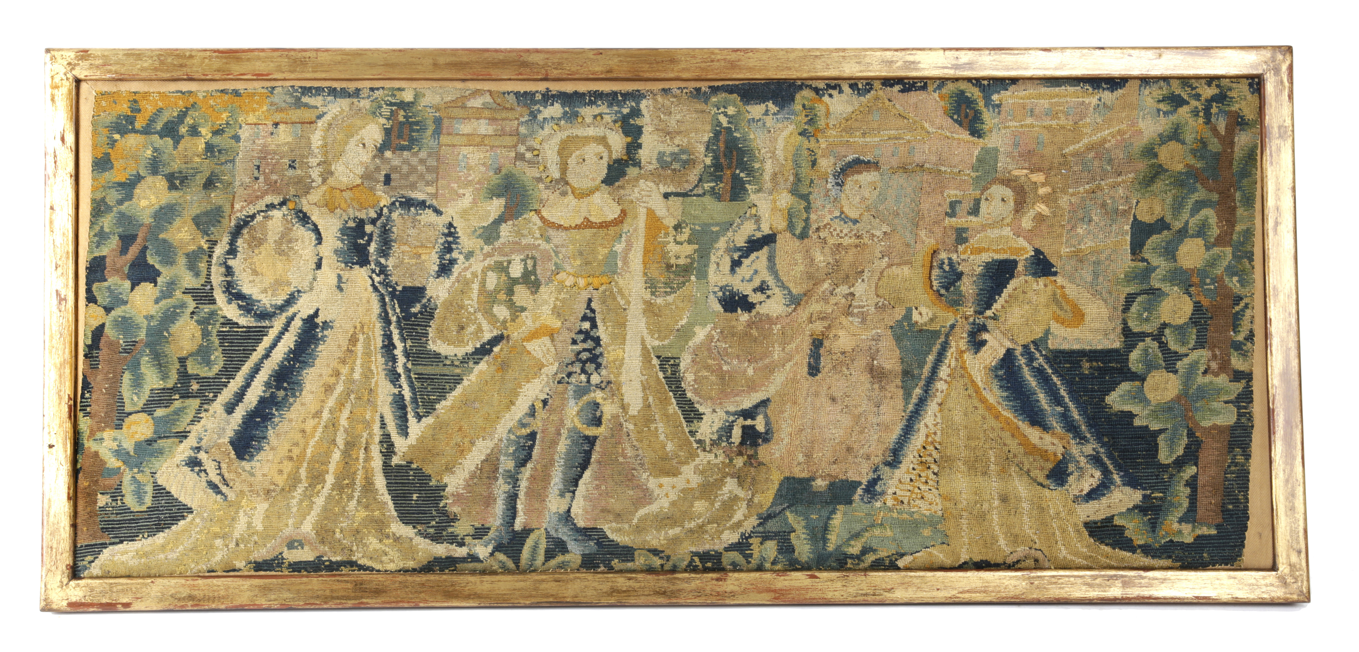 designed with four finely dressed maidens flanked by fruiting trees, with buildings to the far ground, in a giltwood frame