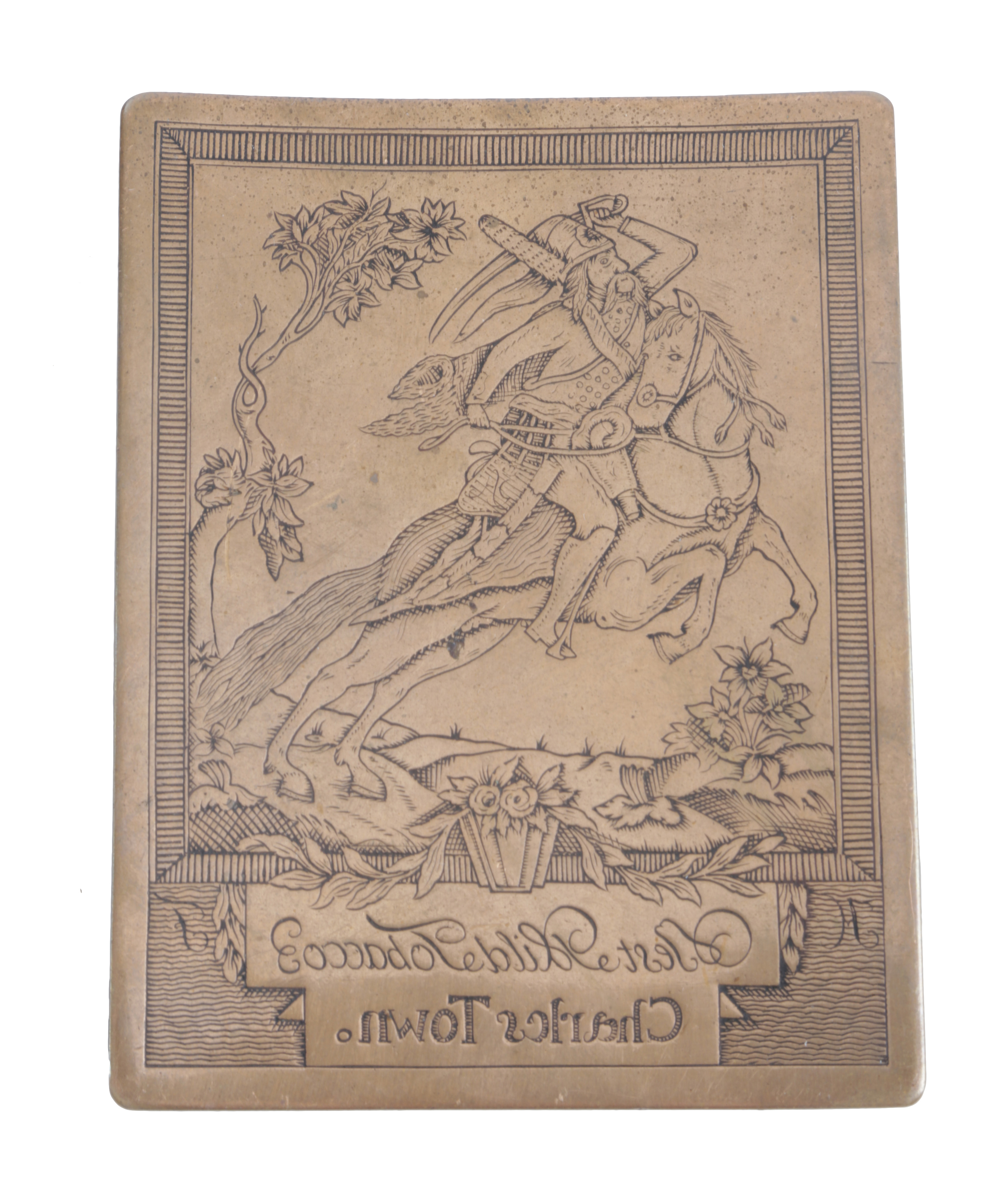 of small rectangular form, designed with a male riding a leaping horse, above a mirror inscription ‘Best Mild Tobacco’ over ‘Charles Town’