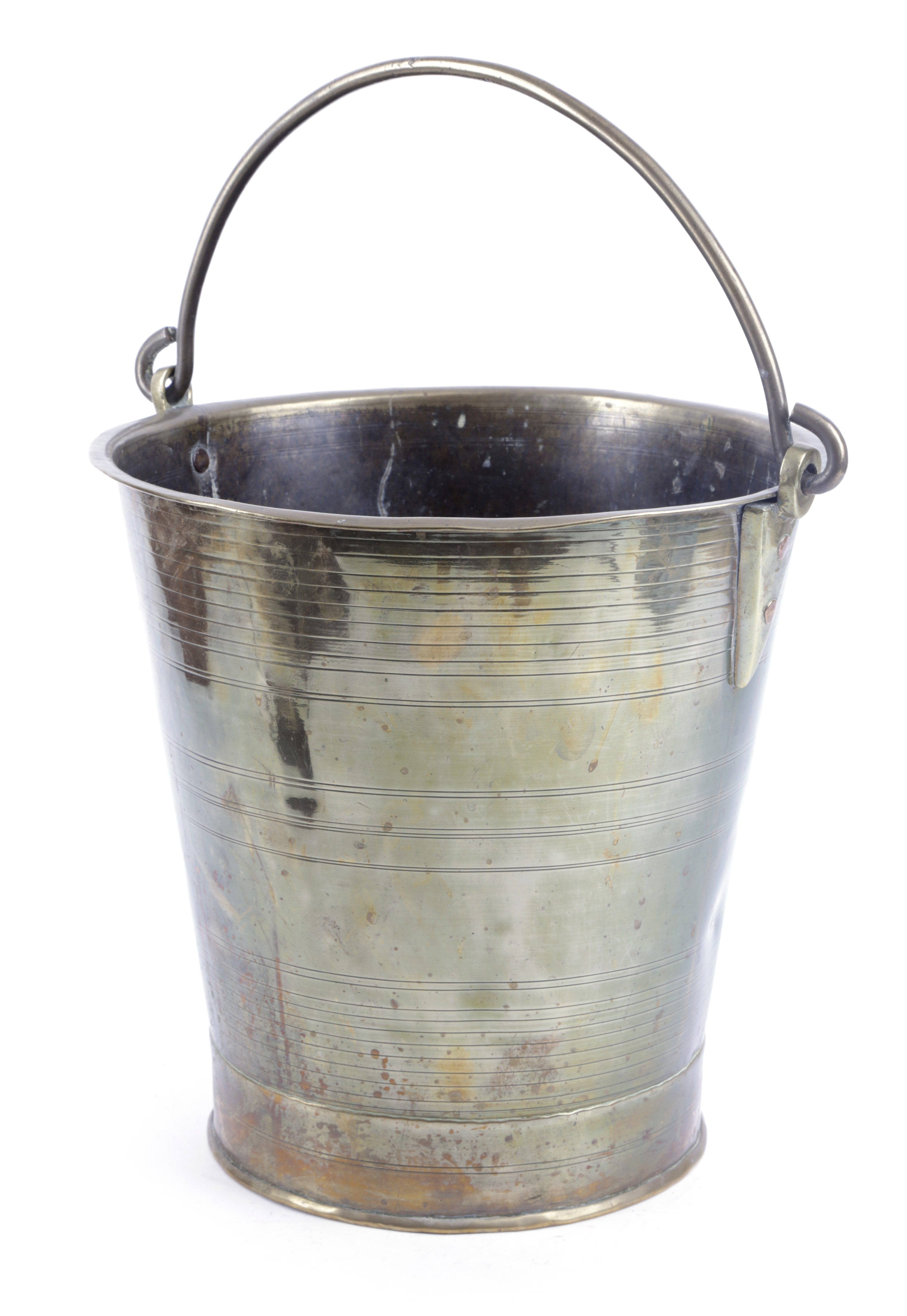 the tapering straight-sides with multiple linear bands, reinforced base and folded rim, the swing handle with copper rivet raised attachment