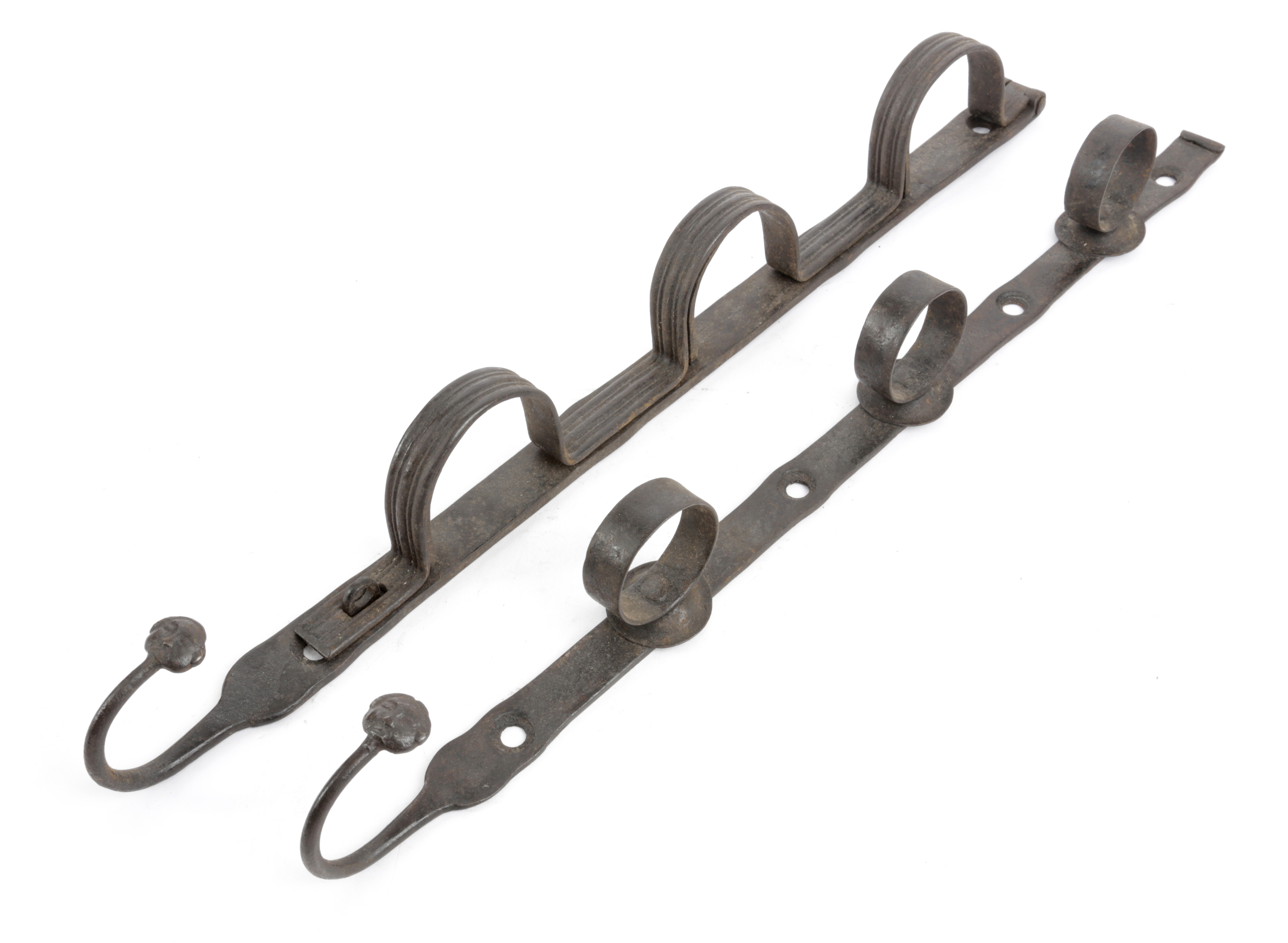 of two straps, one with hinged cover of three arches to cover the grip of the gun and secured at the base with a loop for a former padlock, the other strap with three loops to hold the stock of the gun, each with a hooked terminal with a human face finial (2)