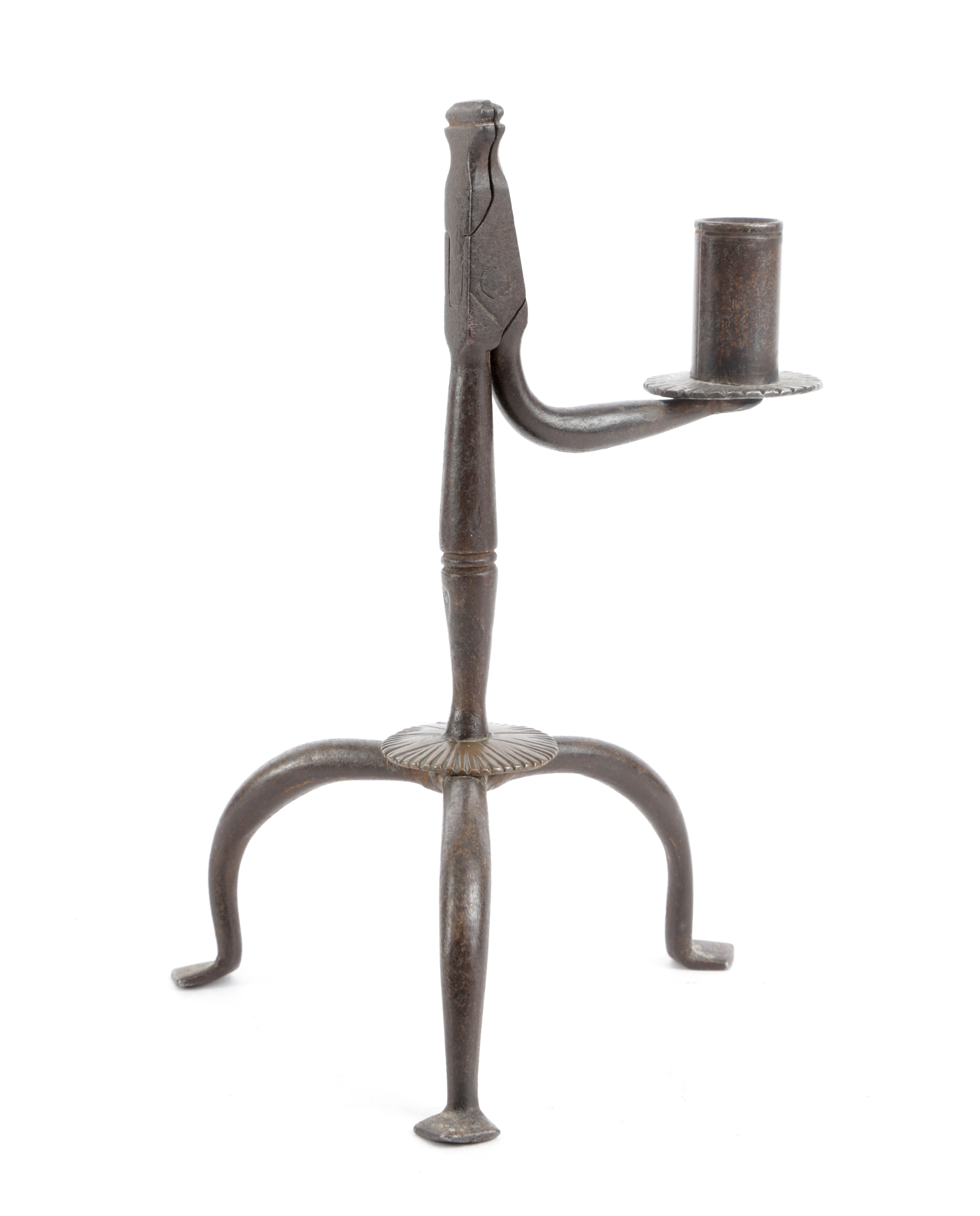 having ‘hoe’ flat-edged jaws, the candle socket counterweight above a serrated drip-pan, the swelling stem centred by a slender discoid, above a copper serrated disc, on a tripod base with lozenge shaped feet