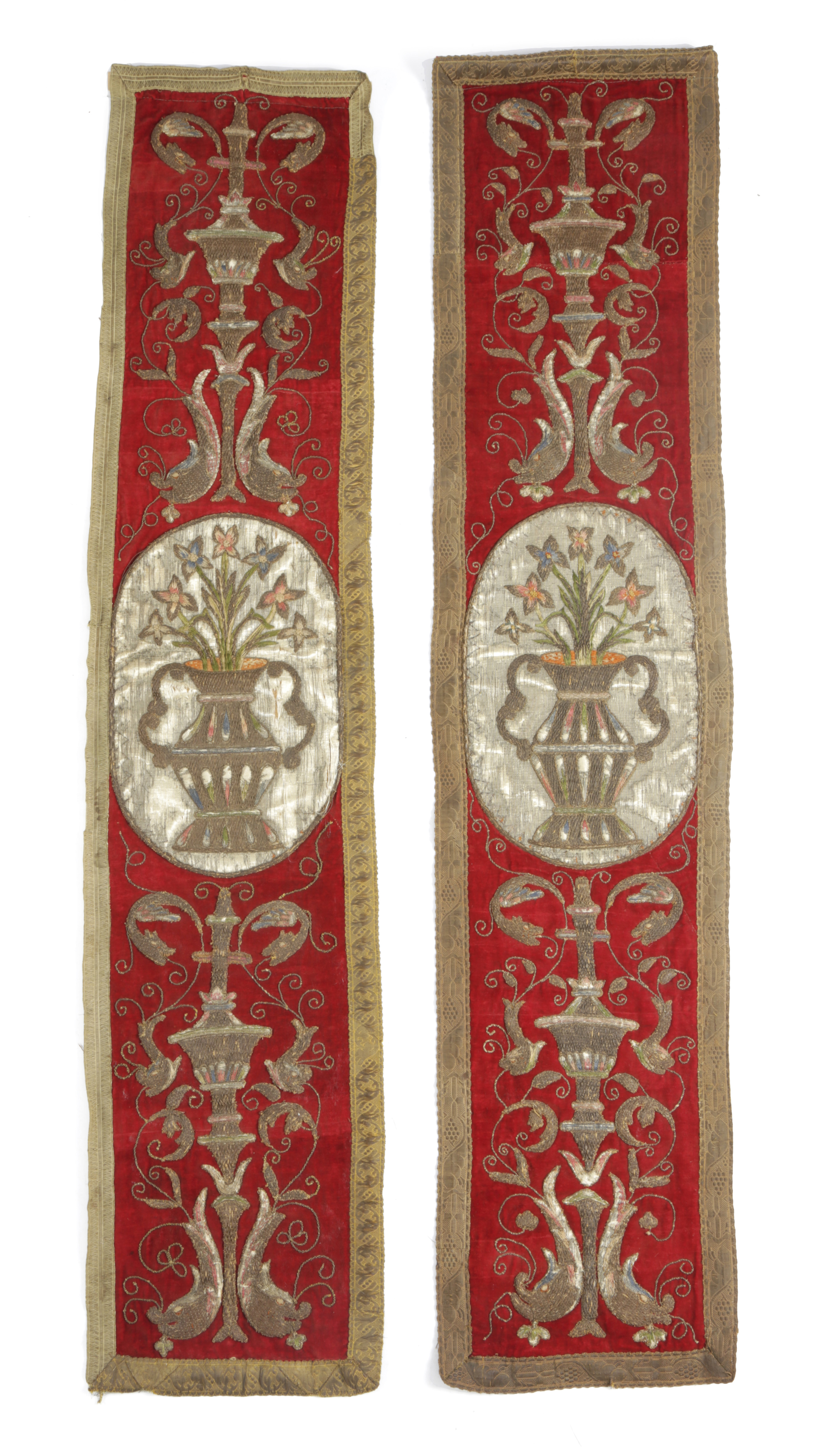 each designed with paired Mannerist stylized fountains, dolphins and leafy arabesques, centred by a twin-handled gadrooned flower-filled vase within an oval medallion, worked in colour silk and metal threads on a crimson velvet ground (2)