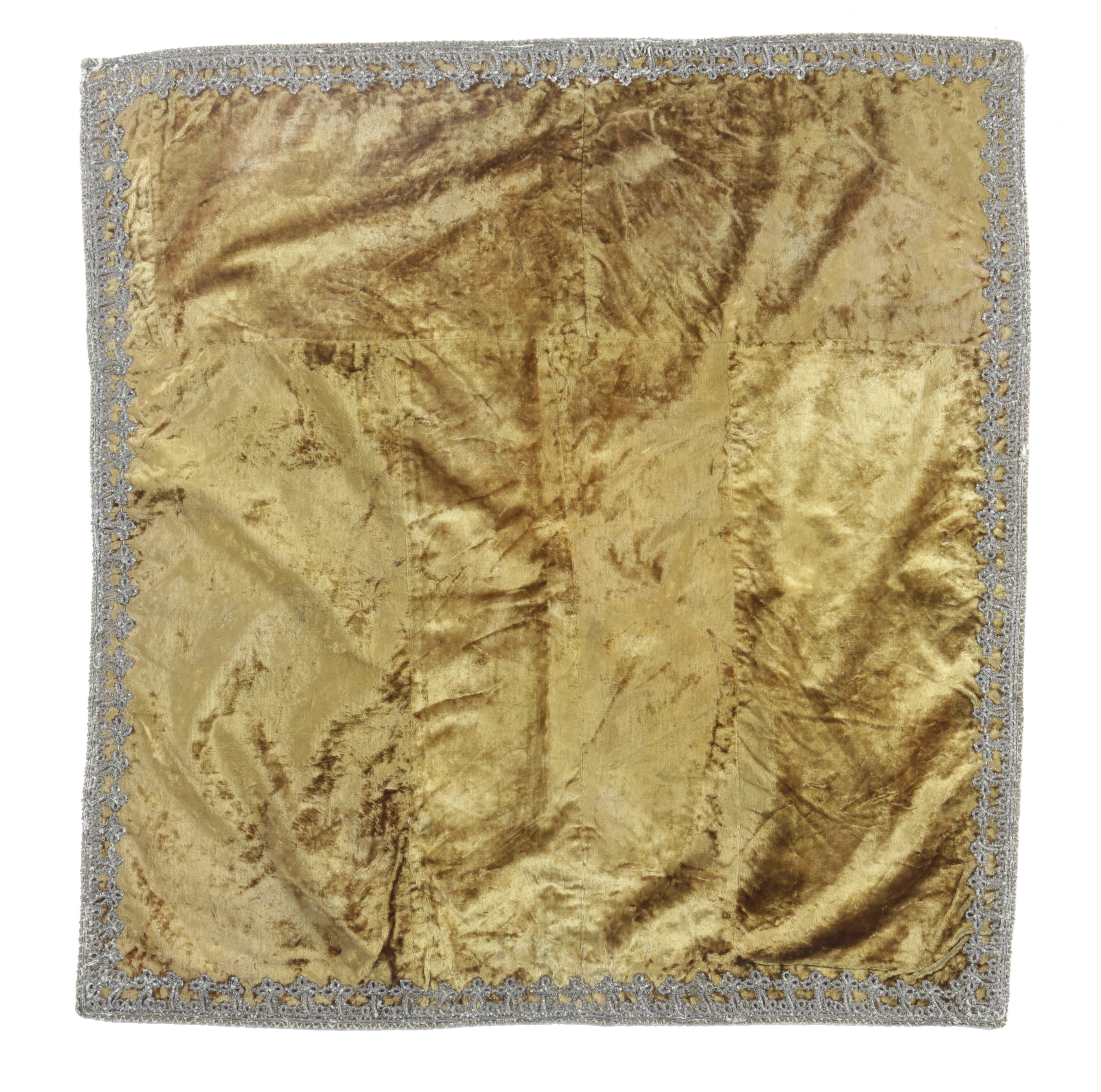 of deep golden colour, edged with a gilt metal braid and backed with an early 20th century pale green cotton damask