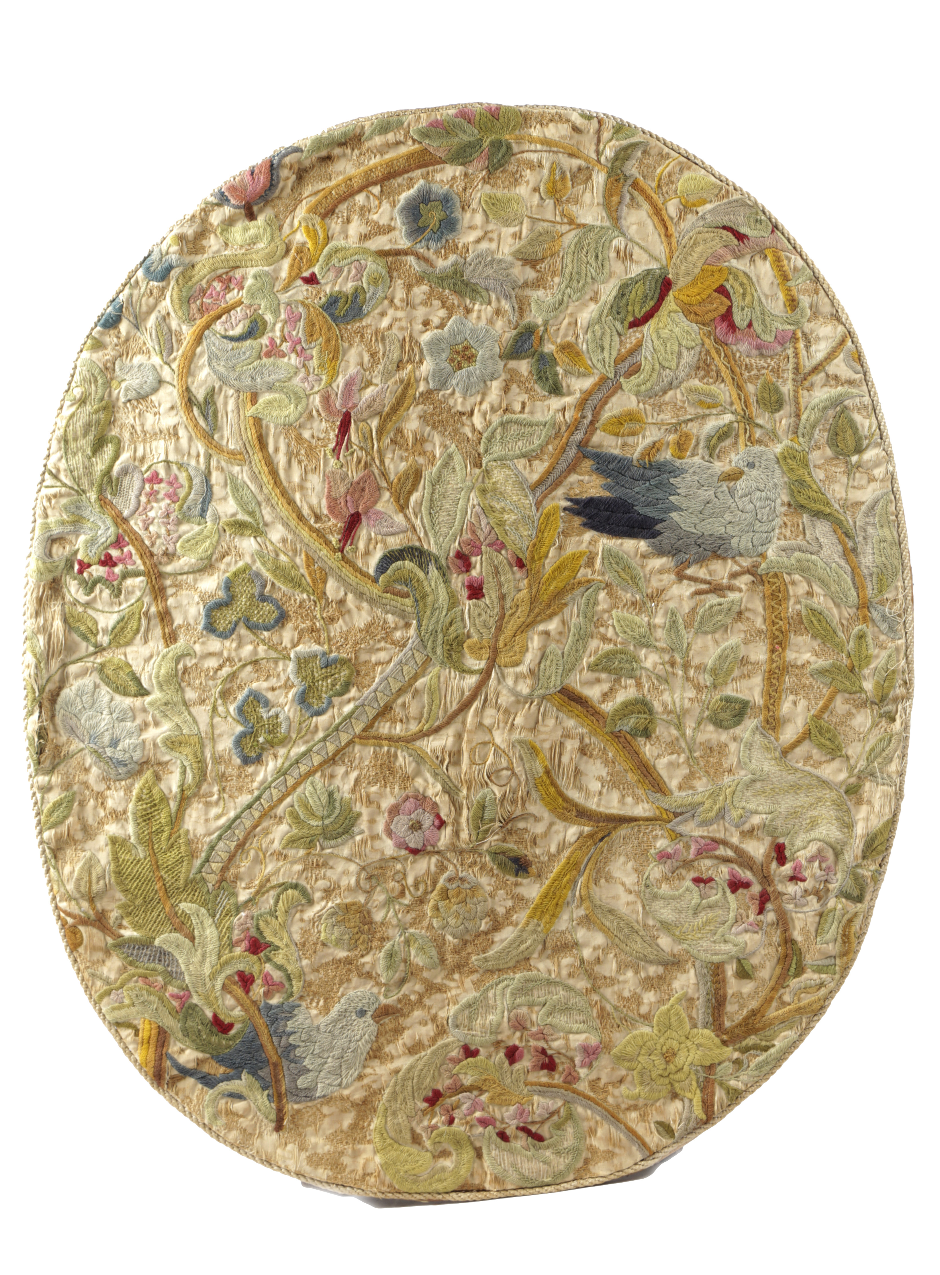 AN OVAL CREWELWORK PANEL