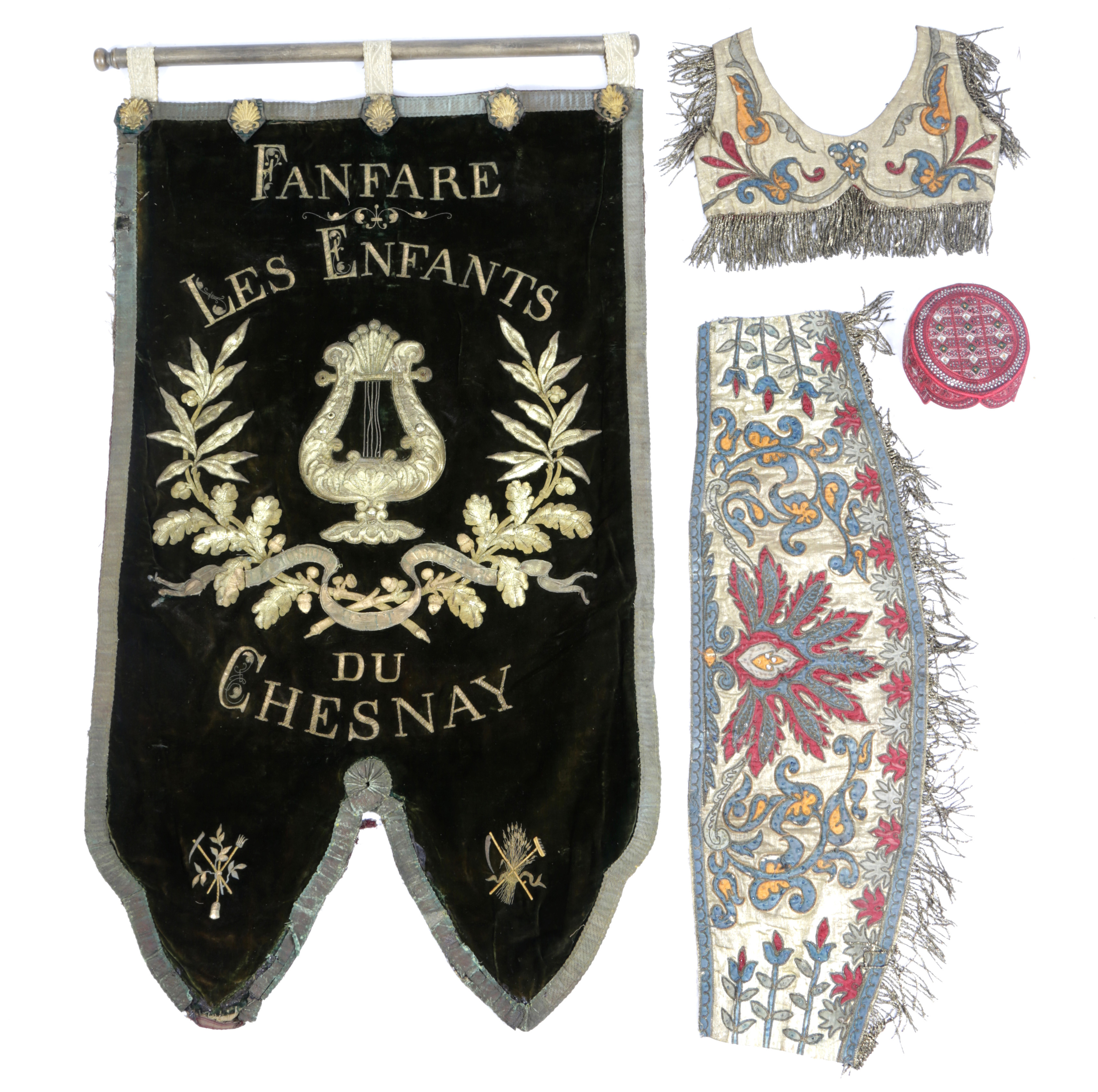 inscribed 'Fanfare Les Enfants du Chesnay', together with two silk and gilt panels and a cap (4)