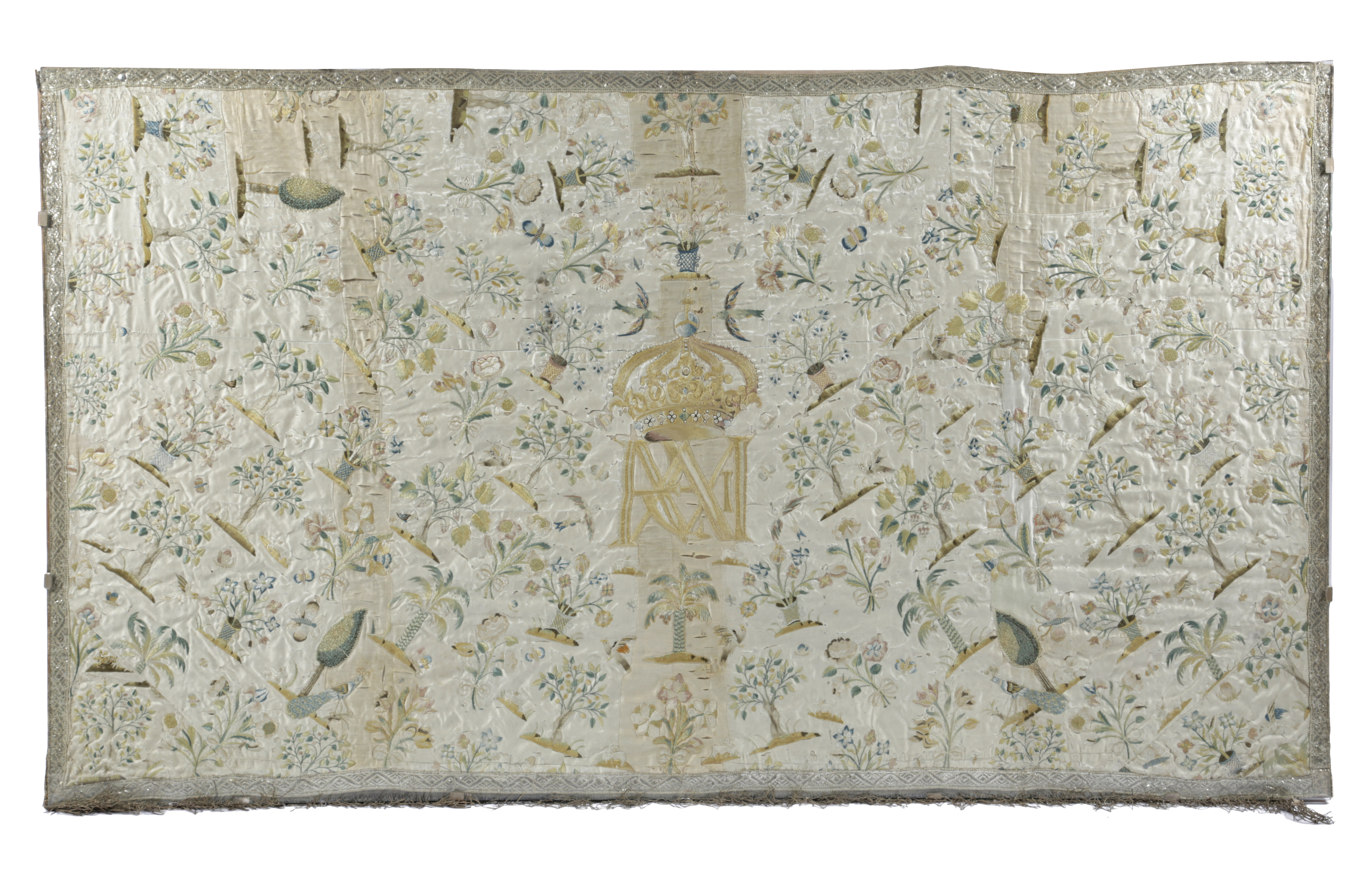 worked in coloured silks with a central monogram beneath a crown and surrounded by a variety of birds, insects and other animals amongst flowering plants and trees inside a silver thread border and on a cream ground