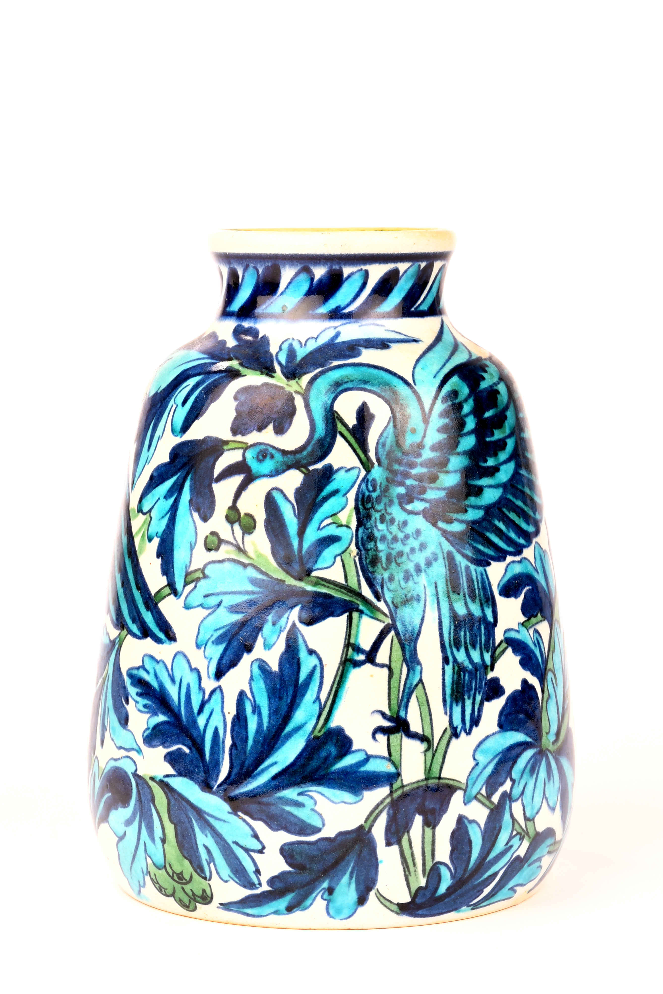 shouldered, tapering form, painted with birds amongst foliate boughs, in blue, turquoise and green on a white ground