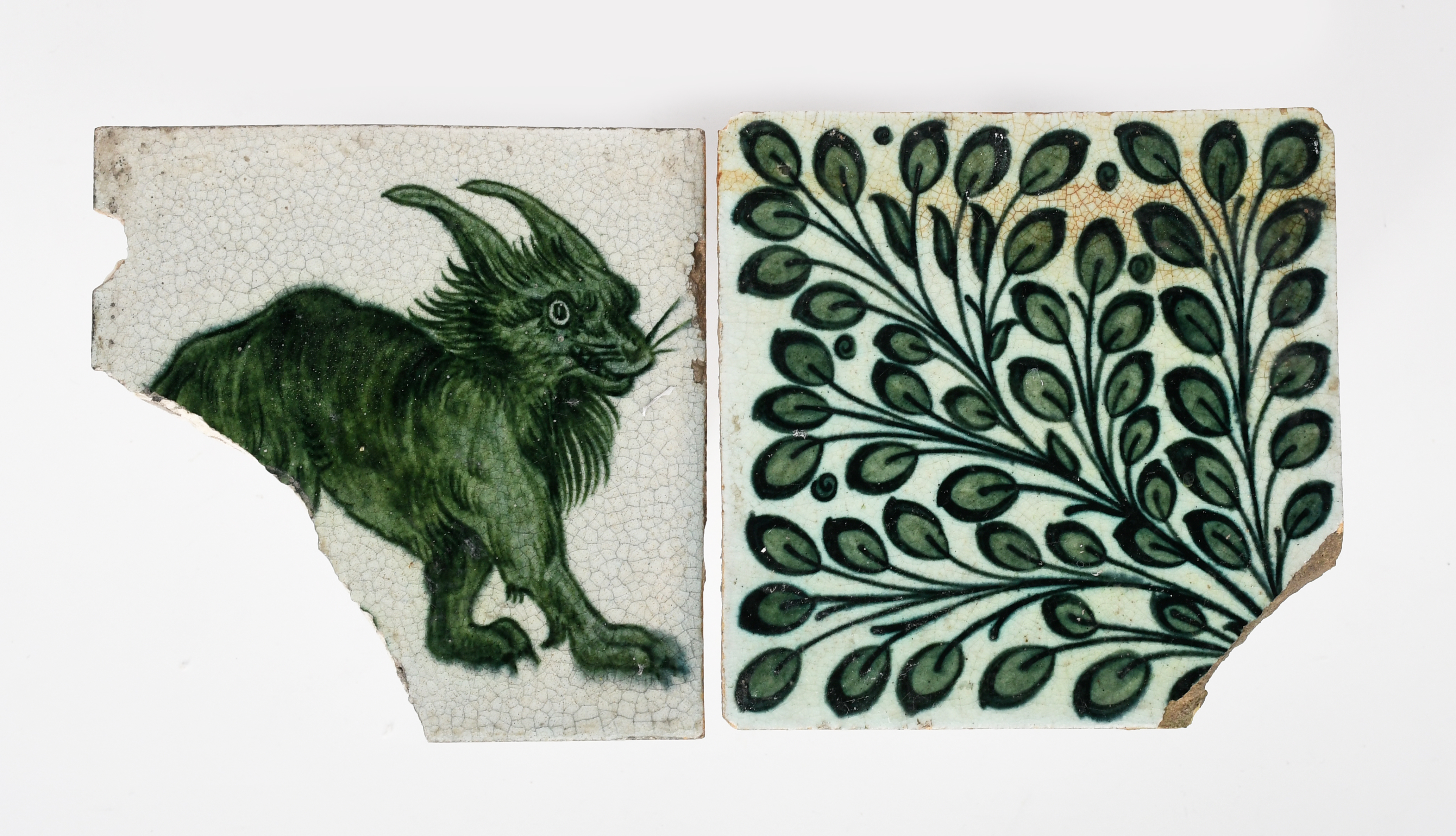painted in green on a white ground; a Sand's End Pottery Oblique Leaf tile, A Tulip dust pressed tile probably Alfred Meakin, in the manner of Charles, Francis Annesley Voysey, glazed in turquoise and blue, framed, a Minton tile printed in blue with cranes flying designed by Dr Christopher Dresser, and another Minton vase, impressed marks,15.5cm. square (5).
