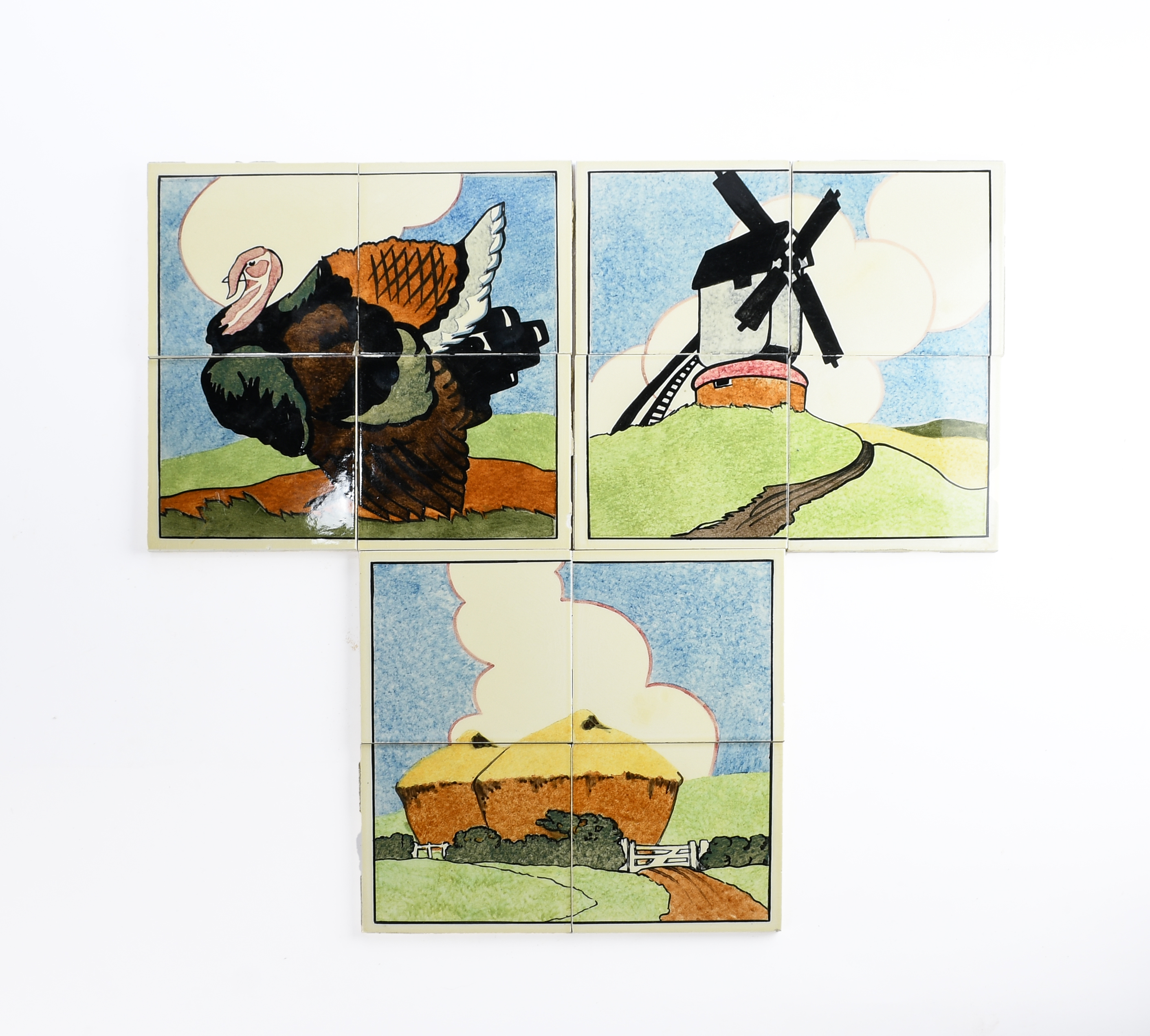 and another Carter's Farmyard Series tile panel decorated with two haystacks and another with a windmill