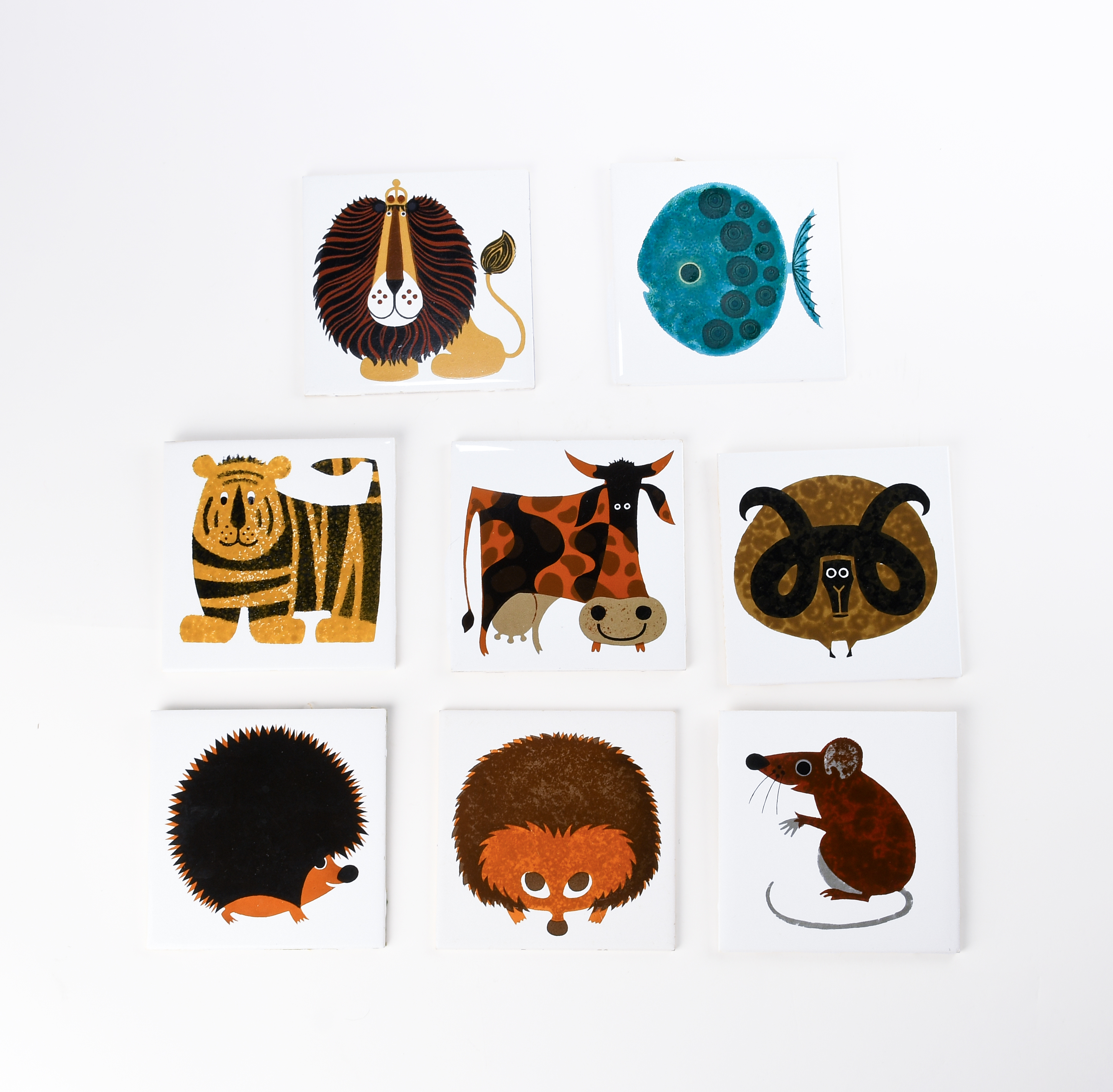 each screenprinted with a comical creature, comprising two hedgehogs, a cow, ram, tiger, lion, mouse, and a fish
