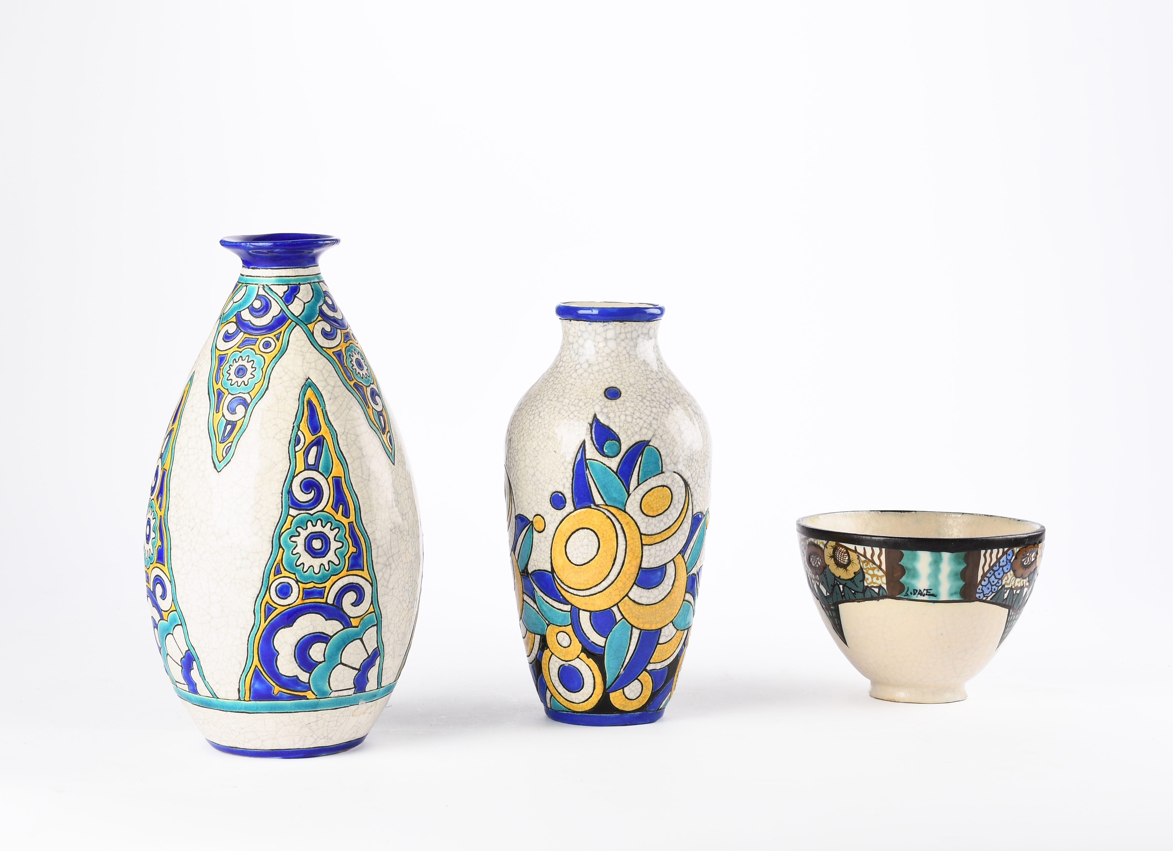 31.5cm high; another Boch Freres Keramis vase and a footed vase by Louis Dage (3).