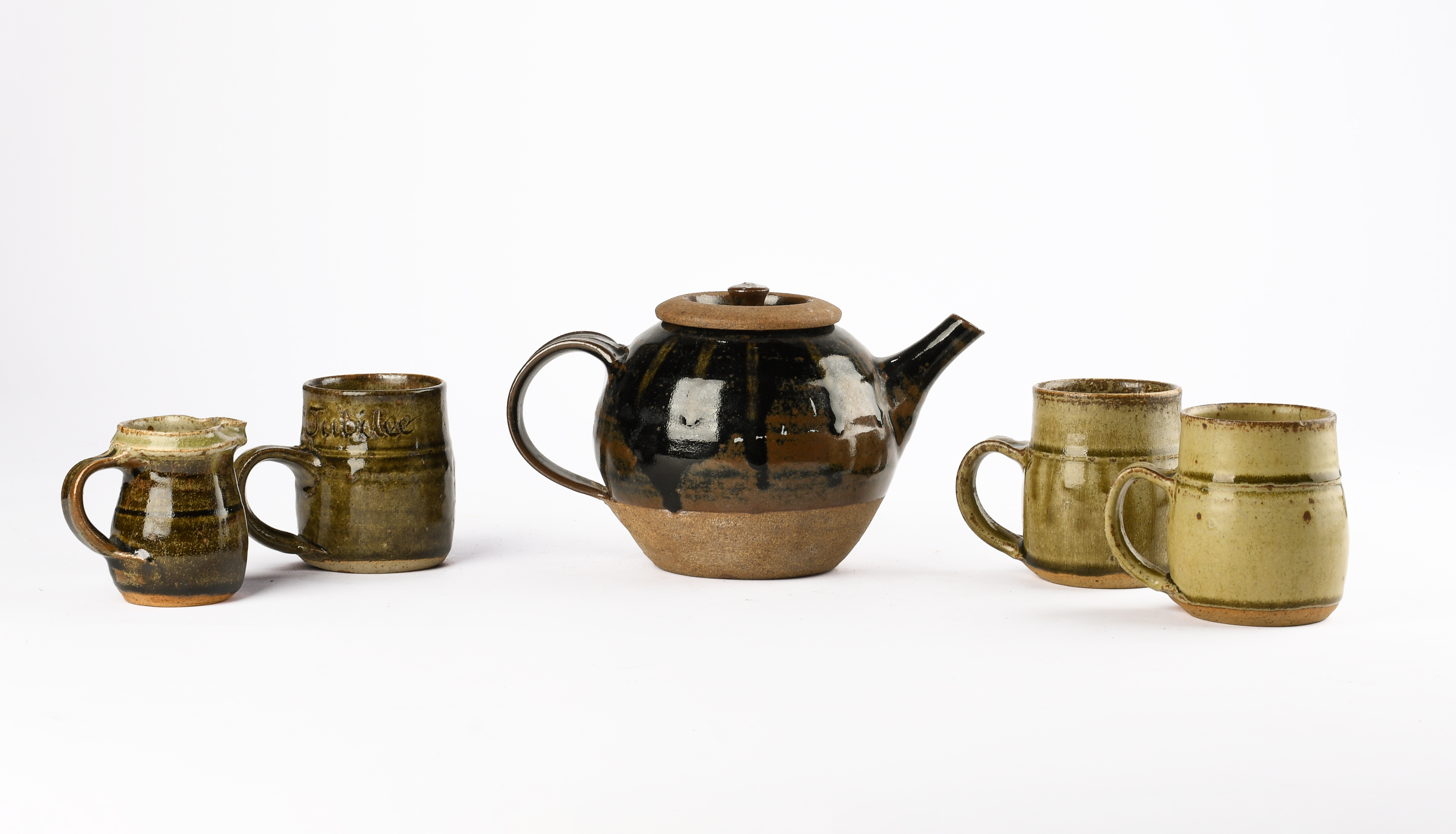 A teapot, three mugs, and a small jug