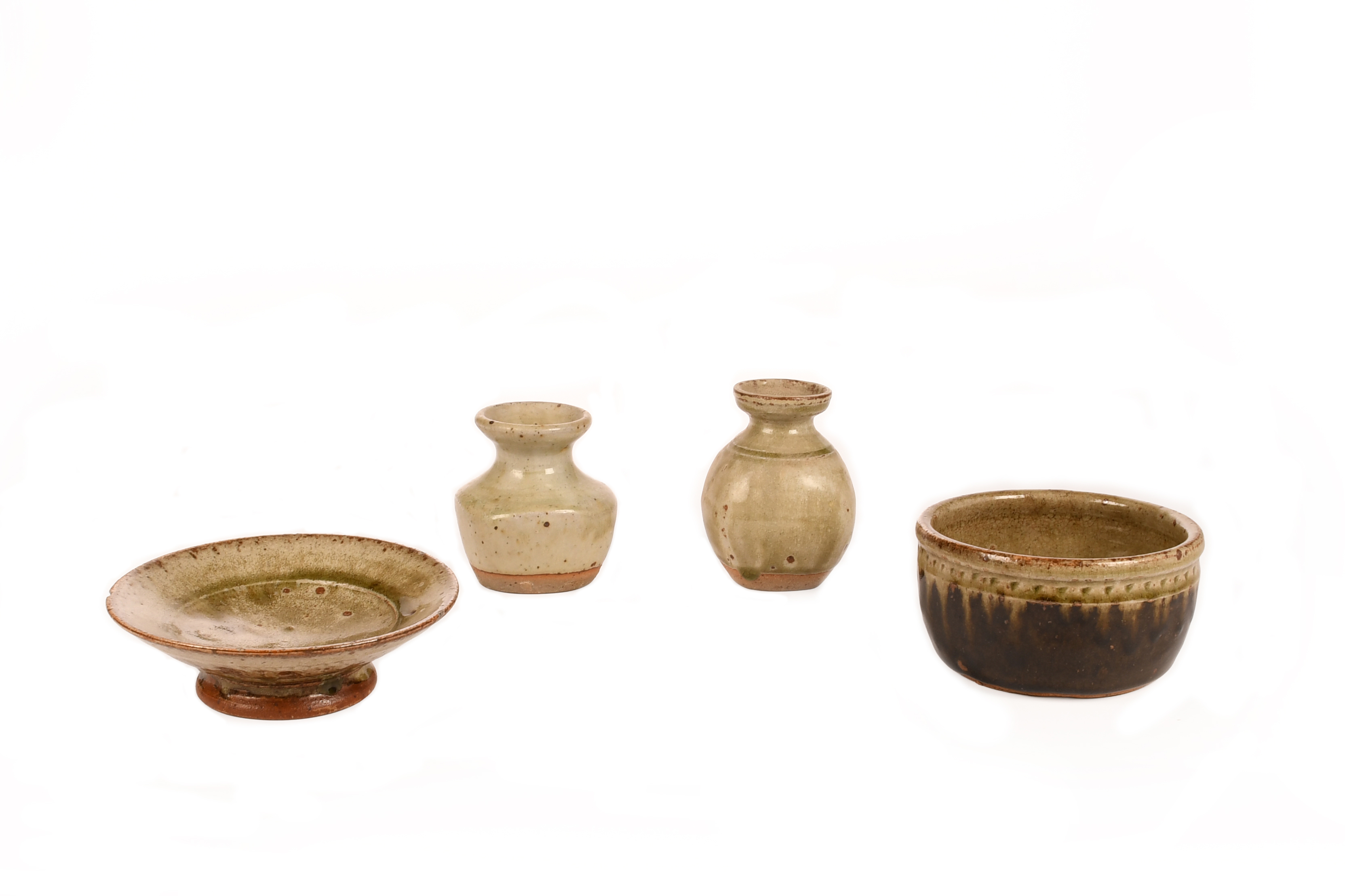 10cm high; and a similar small bottle by Reuben Batterham, and a bowl and a souffle dish by Richard Batterham (4).